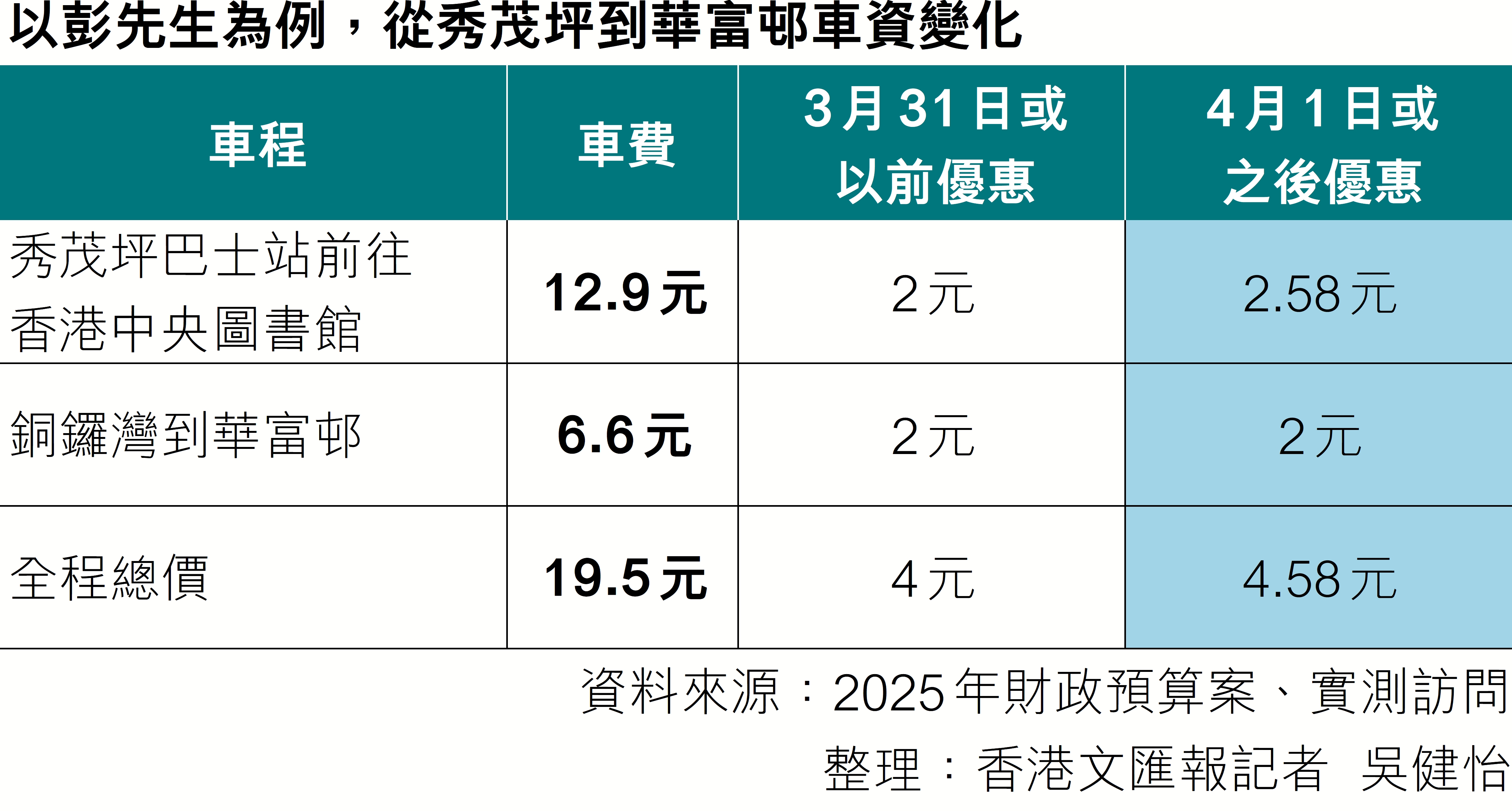香港文匯報記者日前陪同彭先生從秀茂坪出發,體驗他每周五做義工的交通安排。他先於秀茂坪巴士站登上過海巴士前往中央圖書館,該段車程成人票價為12.9元,在新方案下享有兩折優惠、即要支付2.58元;下車後他轉乘另一路線往華富邨,票價6.6元,新方案下繼續享有2元優惠,即兩程總車費變為4.58元,來回則需9.16元,原價為8元,實則來回多付1.16元。
