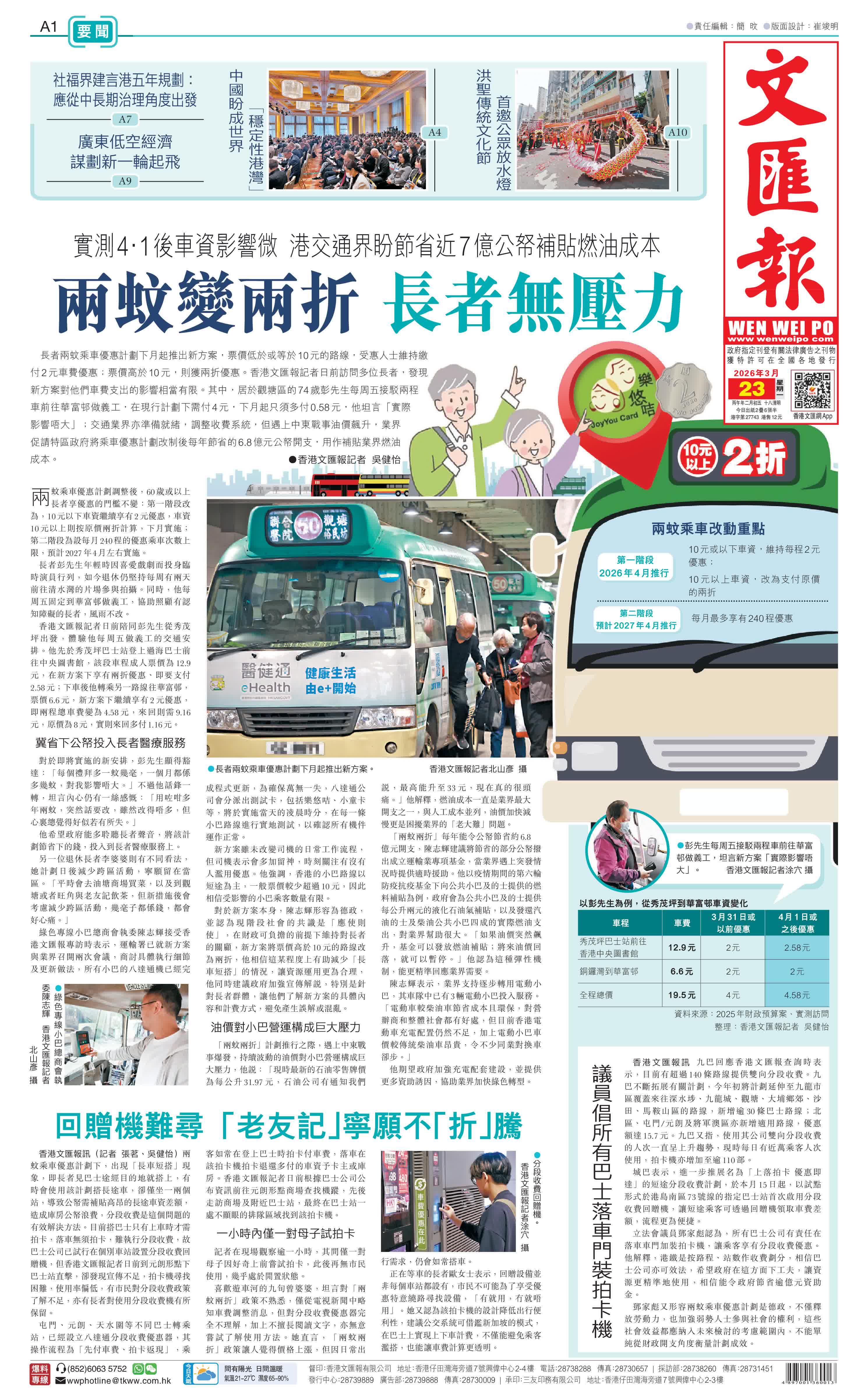 (香港文匯報記者 吳健怡)長者兩蚊乘車優惠計劃下月起推出新方案,票價低於或等於10元的路線,受惠人士維持繳付2元車費優惠;票價高於10元,則獲兩折優惠。香港文匯報記者日前訪問多位長者,發現新方案對他們車費支出的影響相當有限。其中,居於觀塘區的74歲彭先生每周五接駁兩程車前往華富邨做義工,在現行計劃下需付4元,下月起只須多付0.58元,他坦言「實際影響唔大」;交通業界亦準備就緒,調整收費系統,但遇上中東戰事油價飆升,業界促請特區政府將乘車優惠計劃改制後每年節省的6.8億元公帑開支,用作補貼業界燃油成本。