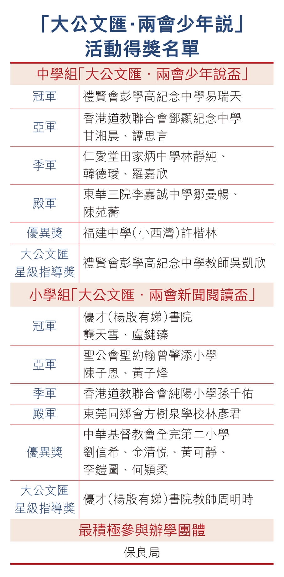 「大公文匯·兩會新聞閱讀盃」小學組冠軍,則由優才(楊殷有娣)書院小六學生龔天雪及小五學生盧鍵臻奪得。他們對獲獎表示高興,感謝香港大公文匯傳媒集團提供平台,讓他們有機會更深入學習相關知識。