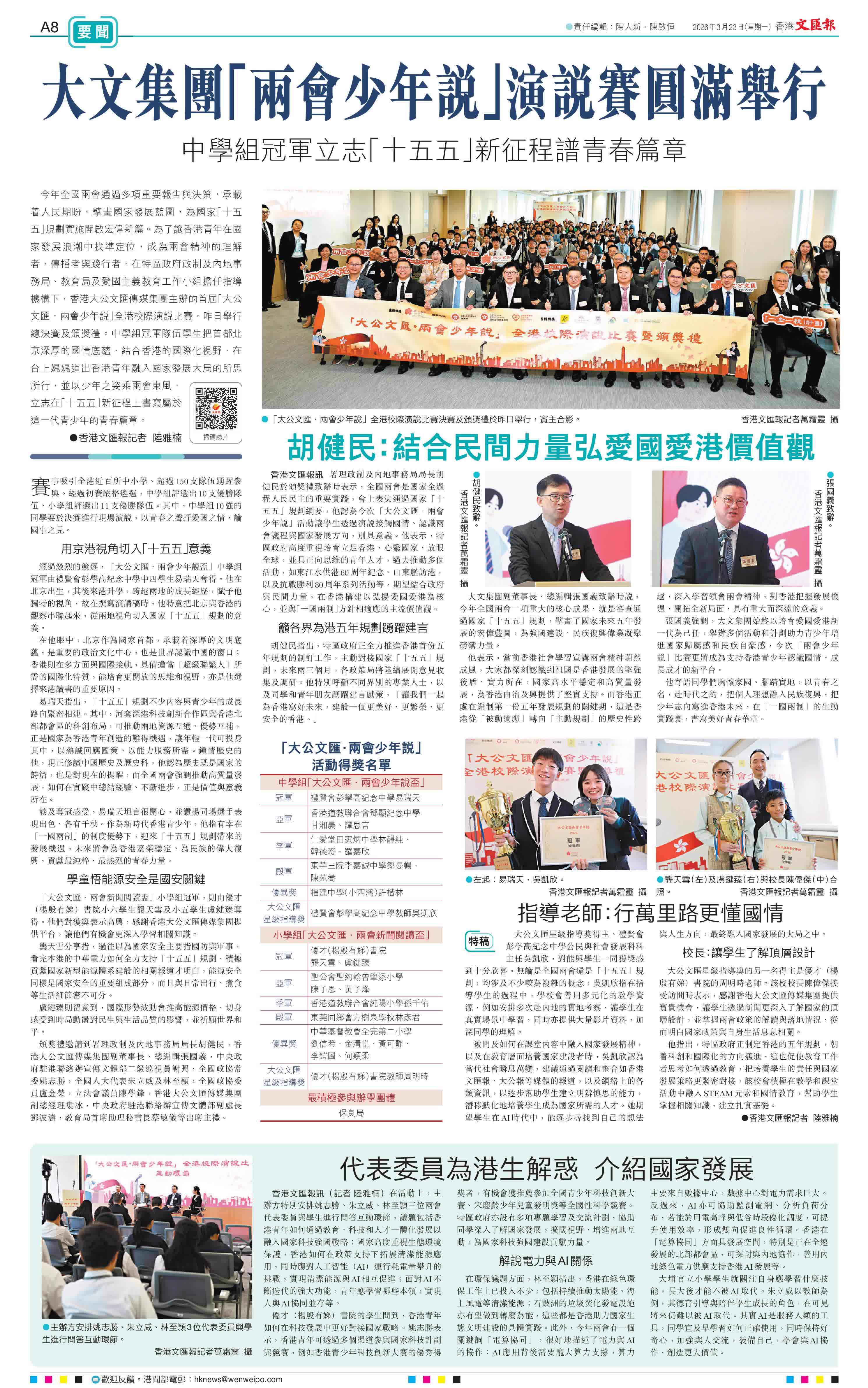 (香港文匯報記者 陸雅楠)今年全國兩會通過多項重要報告與決策,承載着人民期盼,擘畫國家發展藍圖,為國家「十五五」規劃實施開啟宏偉新篇。為了讓香港青年在國家發展浪潮中找準定位,成為兩會精神的理解者、傳播者與踐行者,在特區政府政制及內地事務局、教育局及愛國主義教育工作小組擔任指導機構下,香港大公文匯傳媒集團主辦的首屆「大公文匯·兩會少年說」全港校際演說比賽,昨日舉行總決賽及頒獎禮。中學組冠軍隊伍學生把首都北京深厚的國情底蘊,結合香港的國際化視野,在台上娓娓道出香港青年融入國家發展大局的所思所行,並以少年之姿乘兩會東風,立志在「十五五」新征程上書寫屬於這一代青少年的青春篇章。