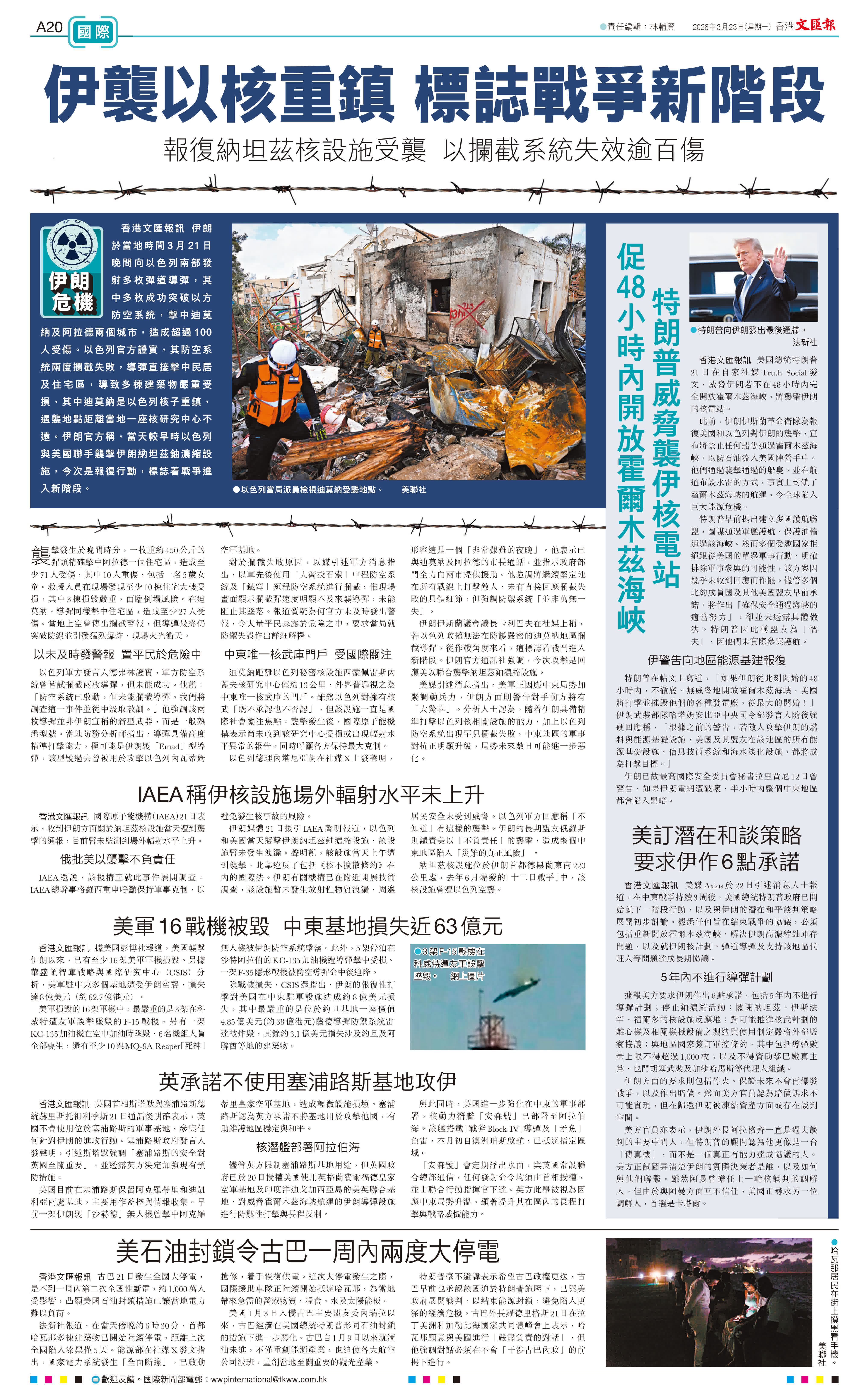 香港文匯報訊 伊朗於當地時間3月21日晚間向以色列南部發射多枚彈道導彈,其中多枚成功突破以方防空系統,擊中迪莫納及阿拉德兩個城市,造成超過100人受傷。以色列官方證實,其防空系統兩度攔截失敗,導彈直接擊中民居及住宅區,導致多棟建築物嚴重受損,其中迪莫納是以色列核子重鎮,遇襲地點距離當地一座核研究中心不遠。伊朗官方稱,當天較早時以色列與美國聯手襲擊伊朗納坦茲鈾濃縮設施,今次是報復行動,標誌着戰爭進入新階段。