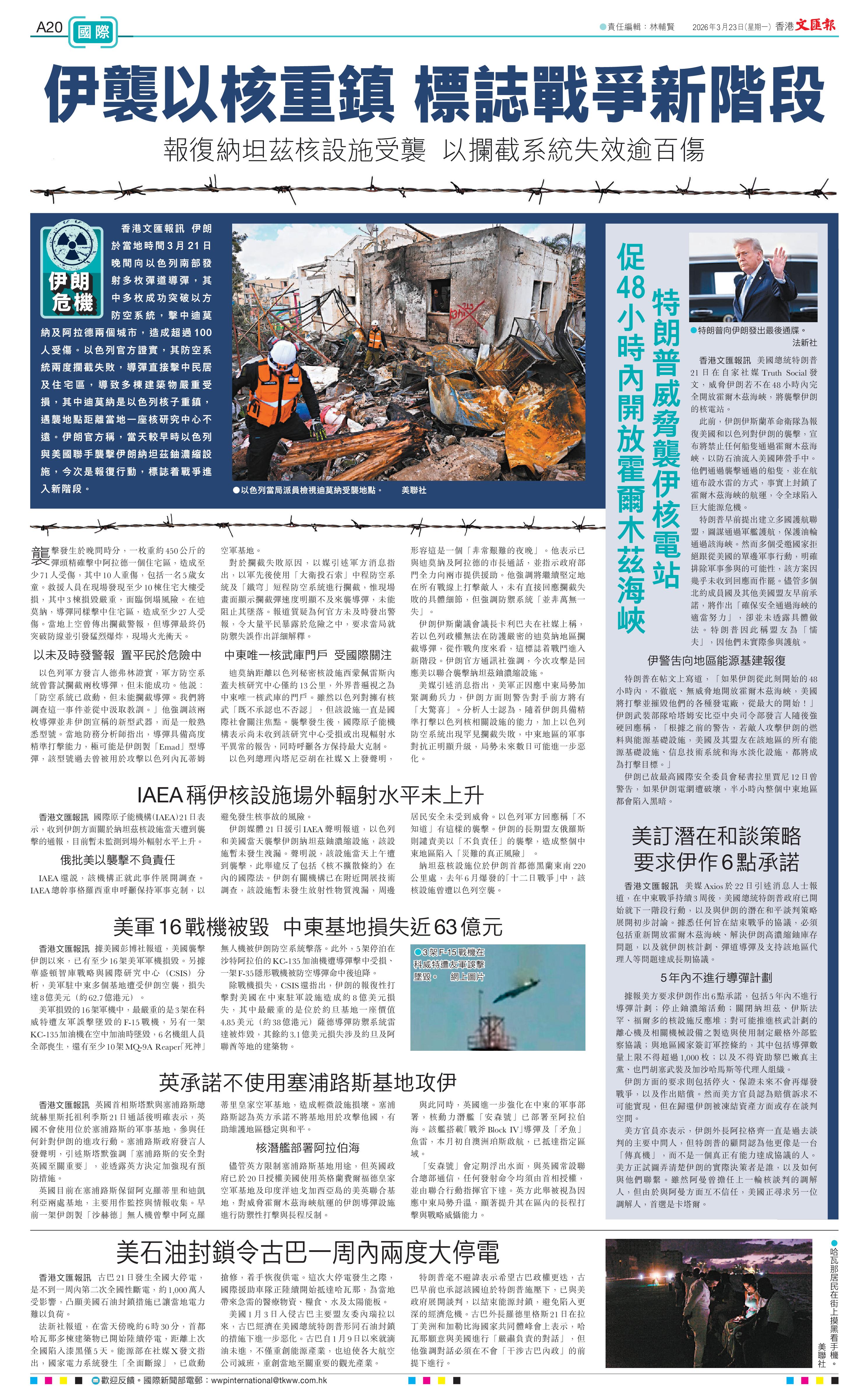 香港文匯報訊 美國總統特朗普21日在自家社媒Truth Social發文,威脅伊朗若不在48小時內完全開放霍爾木茲海峽,將襲擊伊朗的核電站。