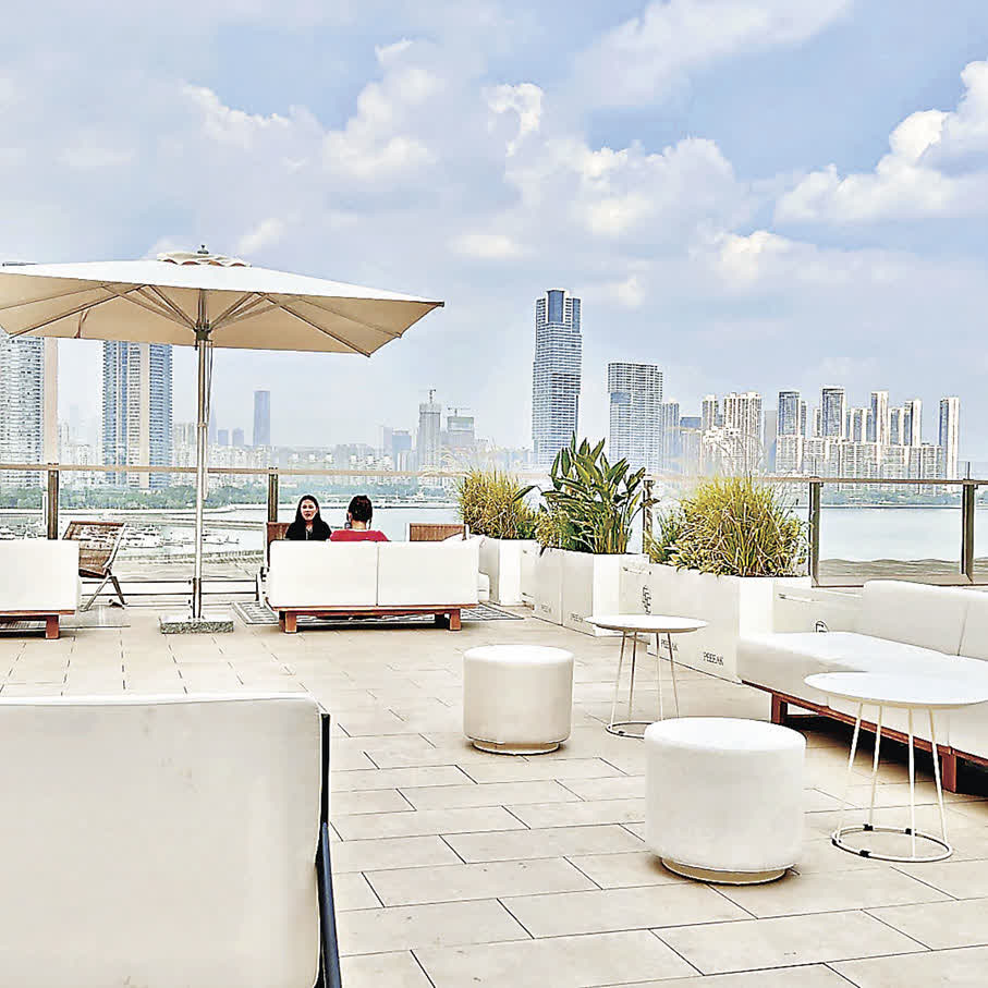 各位港客打完卡,可轉場到K11 ECOAST南館5樓的平台樓層,高級咖啡店「PEEEAK巔」小休一會。店家景觀一流,可180°無遮無擋俯瞰深圳灣大橋,遊輪碼頭的壯麗美景也全收眼底,全場也是室外座位,有懶人梳化、太陽椅及白色大傘遮蔭,將整片大海一擁入懷。大家點一杯飲品及一件蛋糕,面向大海,Chill級寫意。值得一提,遇上天氣好的日子,還能看到美麗的海邊夕陽。食品方面,團購單人餐¥79.9,包一件Tiramisù,可選一杯飲品,咖啡推介「開心果維也納」,杯面是濃濃的奶及開心果,下方的咖啡口感醇厚,大家亦可試試「鹹芝士拿鐵」。