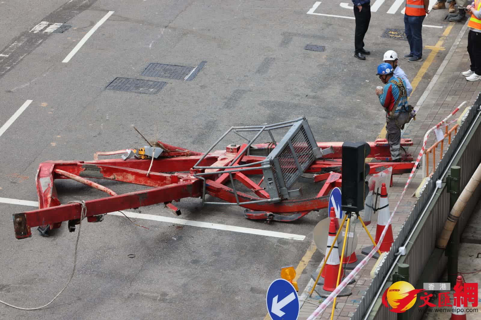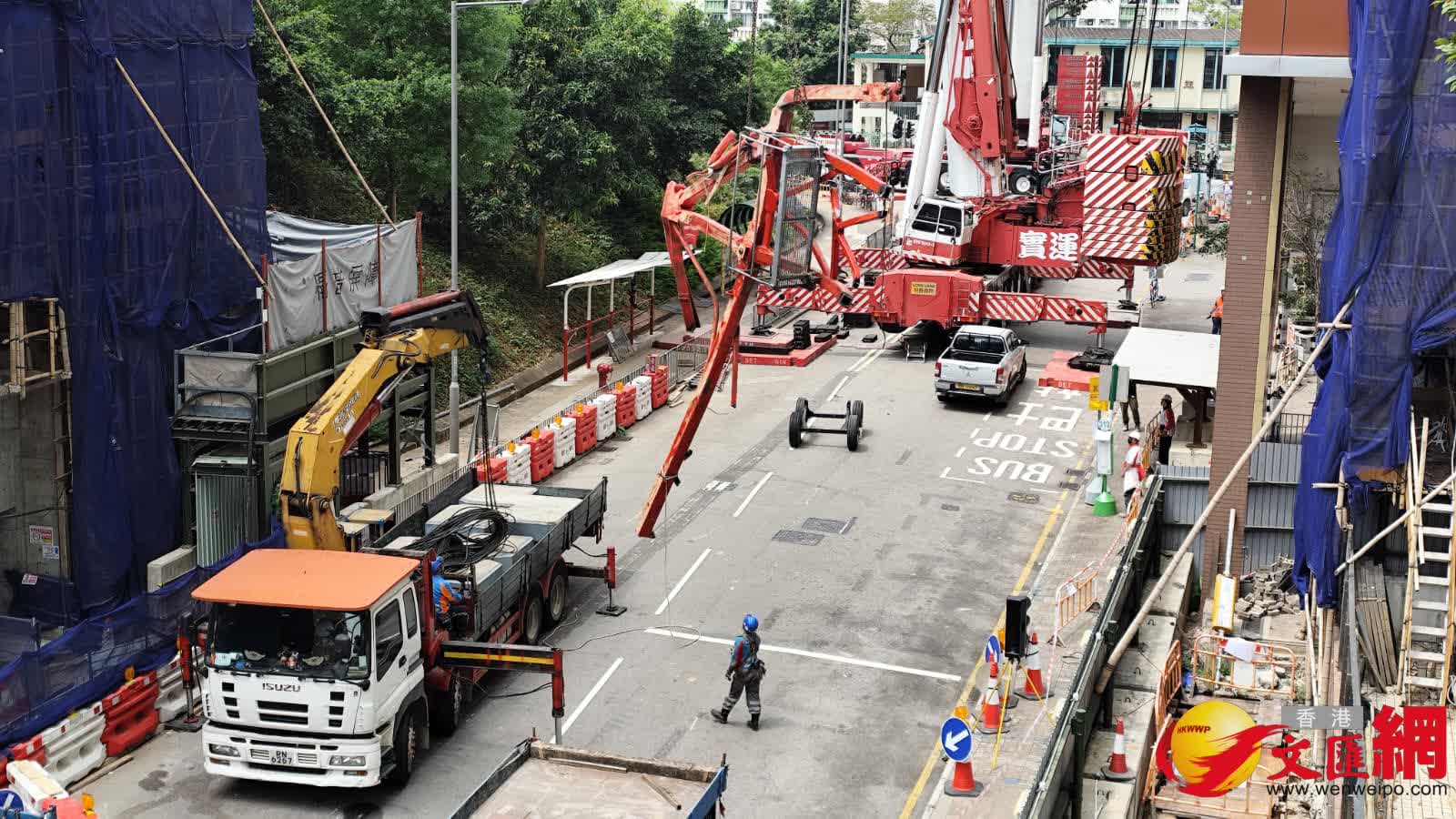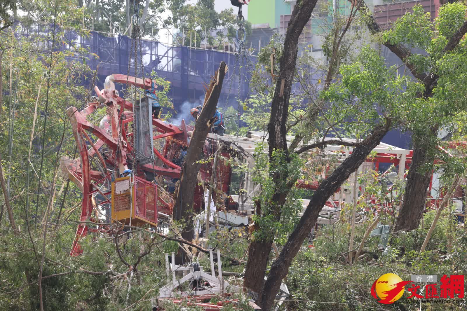 香港文匯報記者現場所見,除有大型工程車停泊在地盤外,另有多名工人正倒塌在山坡上的天秤殘骸上施工,分別用風煤燒焊將天秤切割成細小部件再逐一吊離山坡,但見部分殘骸明顯彎曲變型。