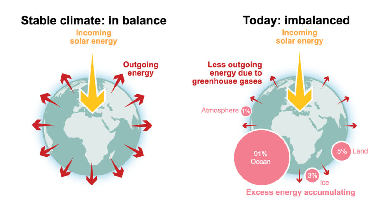 地球能量失衡是指太陽輻射進入地球系統的能量與離開地球大氣層的能量之差。如果進入地球系統的能量大於離開地球大氣層的能量,就意味着大量熱量累積在地球系統中。