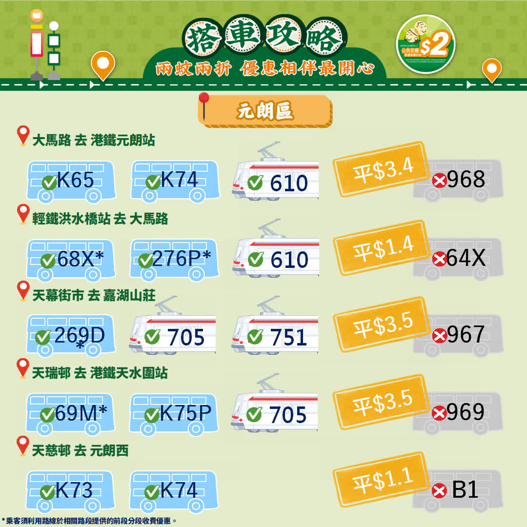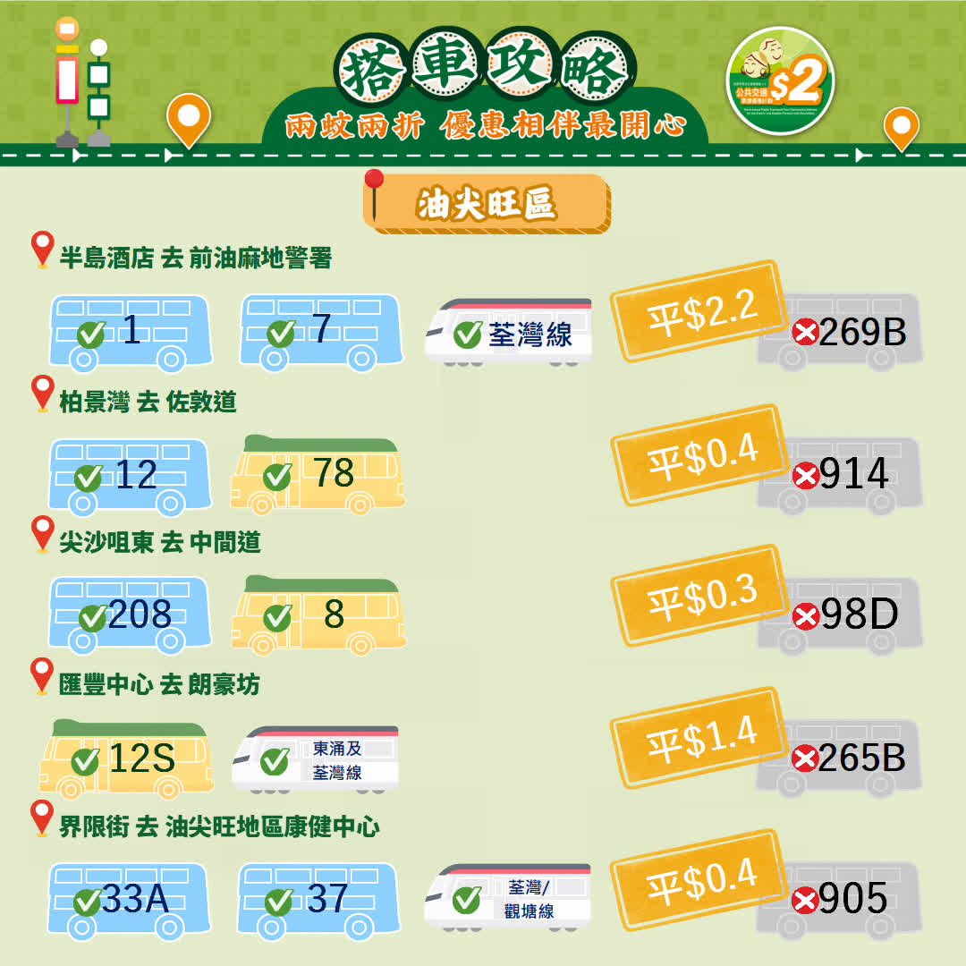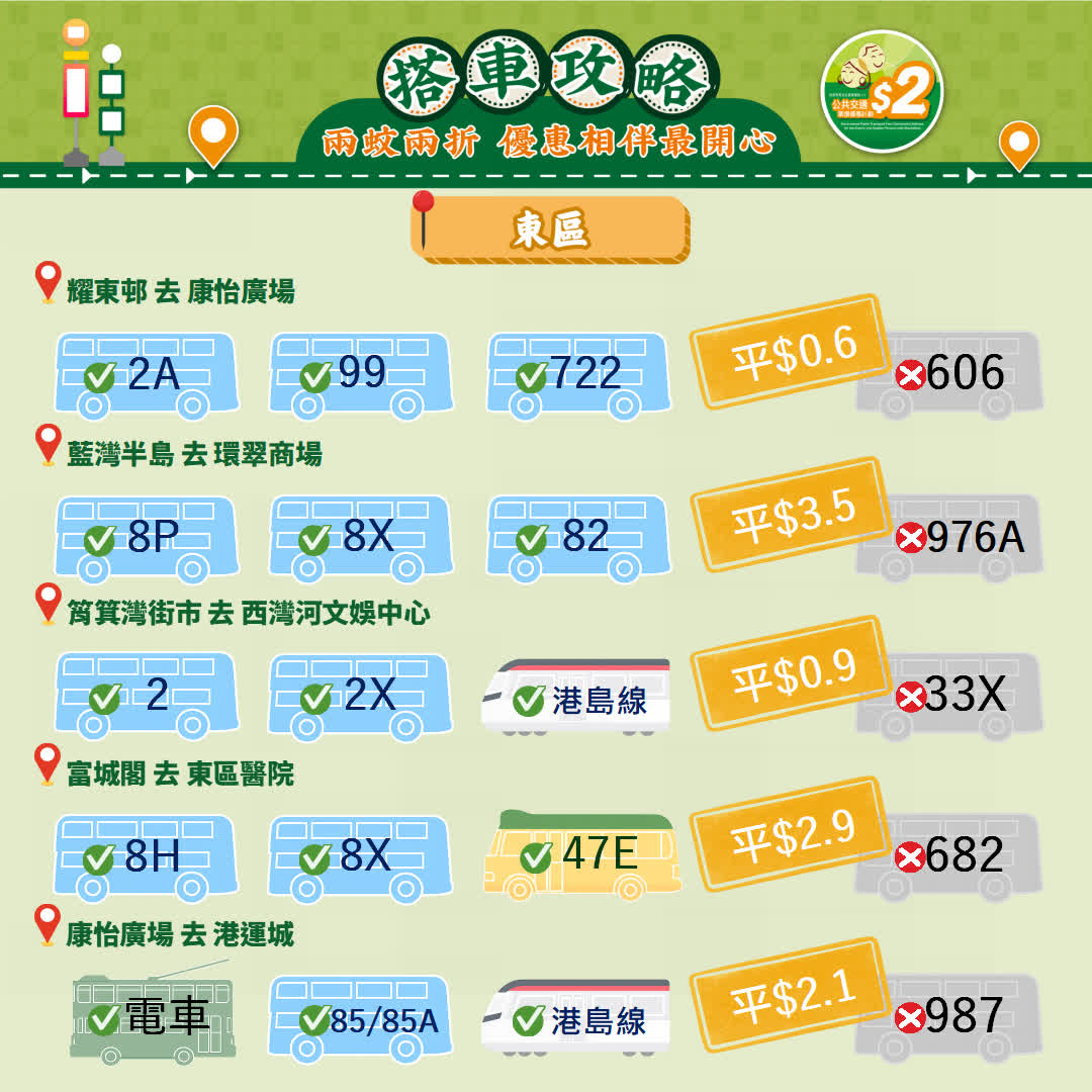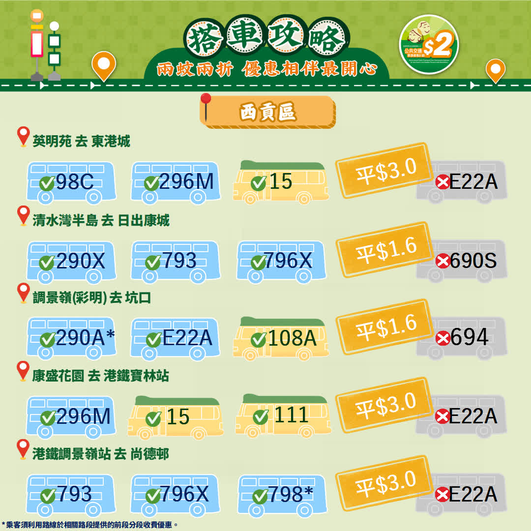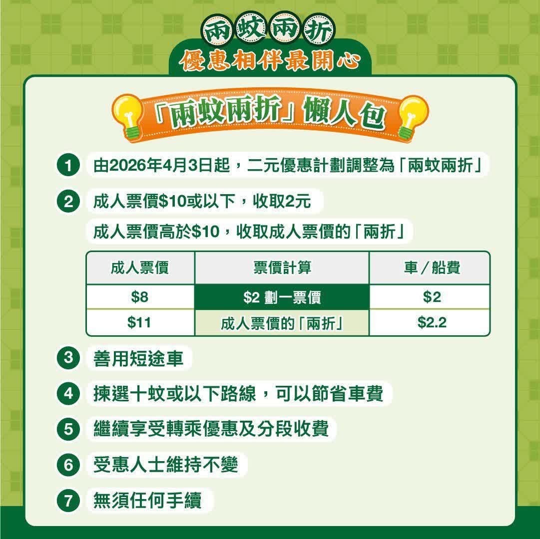 政府今日(23日)宣布,由2026年4月3日起政府長者及合資格殘疾人士公共交通票價優惠計劃(2元優惠計劃),由2元劃一收費調整為「兩蚊兩折」,即成人票價低於或等於10元,受惠人士維持繳付2元車費,而成人票價高於10元則受惠人士須繳付成人票價的兩折,轉乘車程同樣適用。