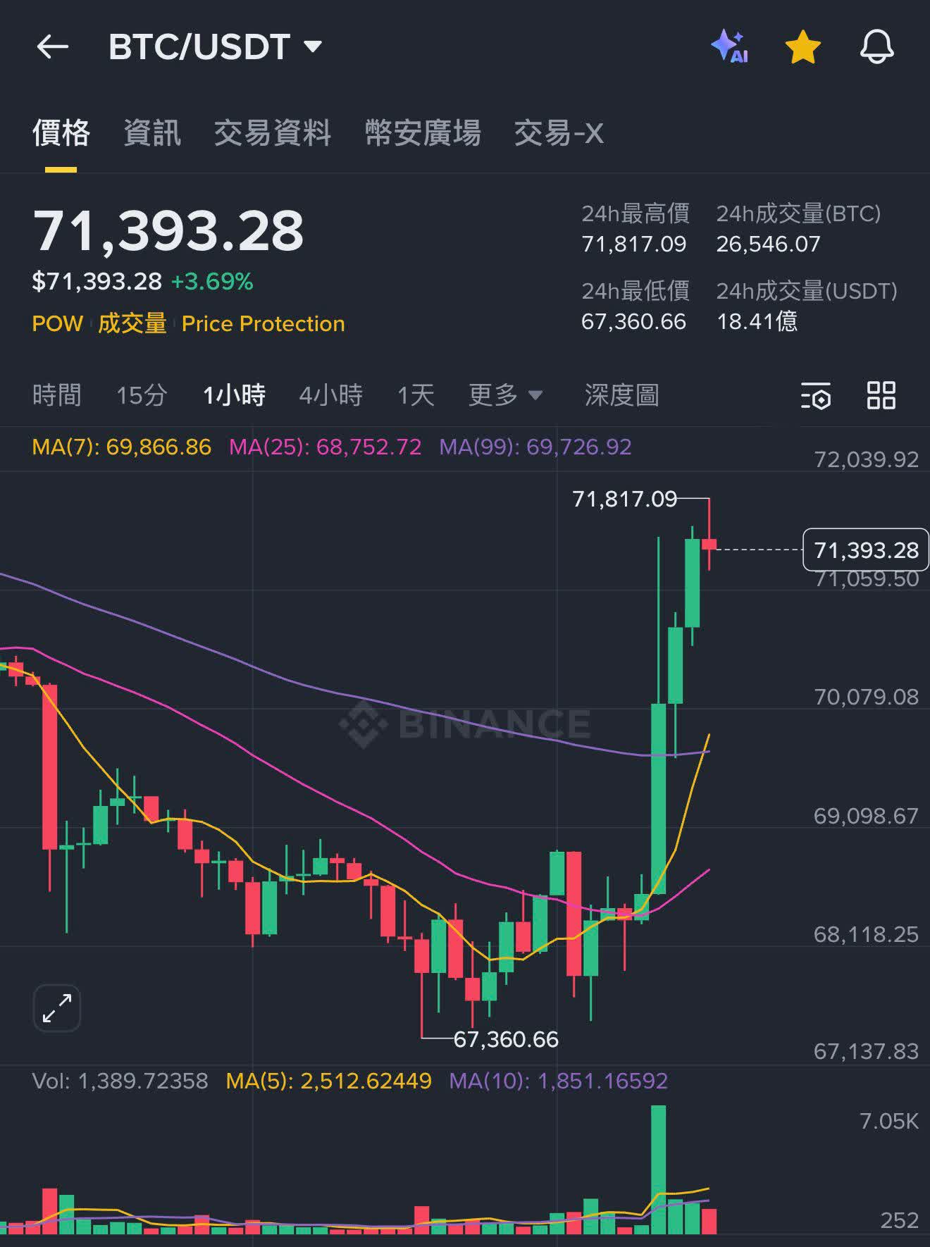 香港文匯報訊(記者 黎梓田)隨着中東地緣政治緊張局勢出現降溫跡象,比特幣BTC強勢迎來反彈,成功收復7.1萬美元大關。據行情顯示,比特幣反彈至7.1萬美元以上水平,現報71,517美元,日內升幅3.87%;以太坊ETH升至2,179美元,日內升幅4.68%。市場分析指出,比特幣4小時短線的「頭肩頂」結構失效,料出現大跌機會較低,未來一周會在6.6萬至7.9萬美元之間反覆橫盤。