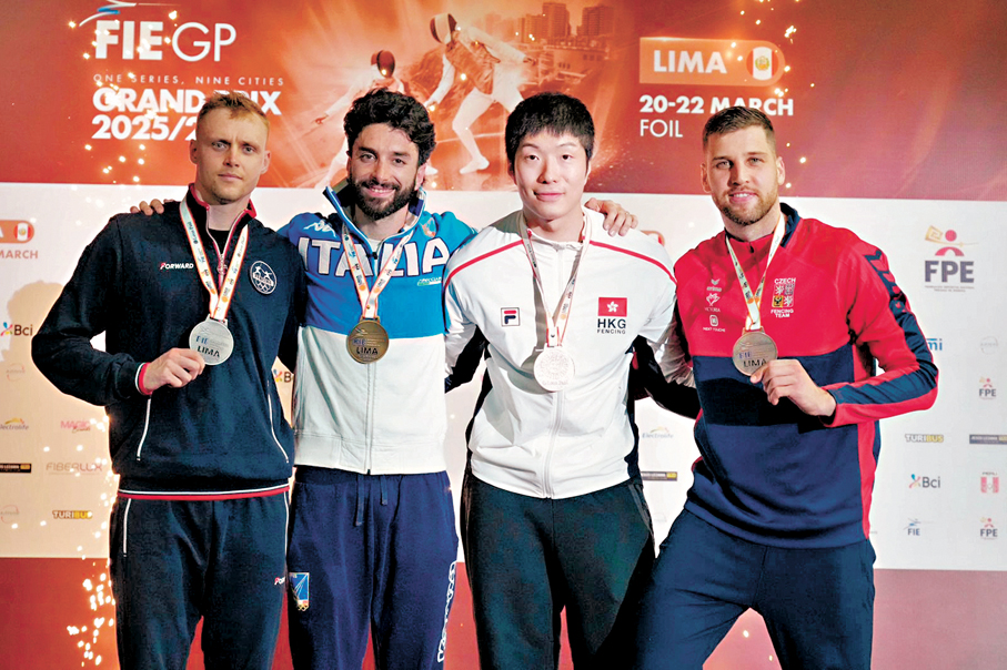 香港文匯報訊(記者 郭正謙)花劍大獎賽2026利馬站,兩屆奧運金牌得主張家朗再有獎牌入袋,這位香港劍手八強先險勝隊友蔡俊彥晉級,到四強雖然不敵中立選手保路達捷夫,但仍獲得一面銅牌,連續兩站賽事踏上頒獎台。