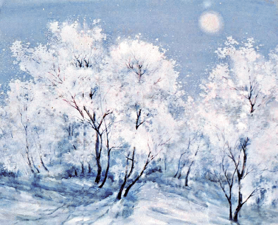 說起在扎蘭屯師範學校的那段經歷,我的水彩畫創作曾有過一段高光時刻。我的水彩畫作品《月下》入選內蒙古美術作品赴蘇展 (前蘇聯) , 並刊登於《內蒙古日報》1990年1月2日的報紙上;水彩畫作品《銀色的夢》入選內蒙古自治區水彩畫展,也再次刊登在《內蒙古日報》上;水彩畫作品《雁南飛》入選內蒙古全國美展周邊展。之後又有兩幅水彩畫作品《春》《雅魯河畔》入選呼倫貝爾美術作品赴俄羅斯展出。後來由於工作的變動,我的藝術創作又轉向了中國畫的方向,這些故事我們以後再娓娓道來。