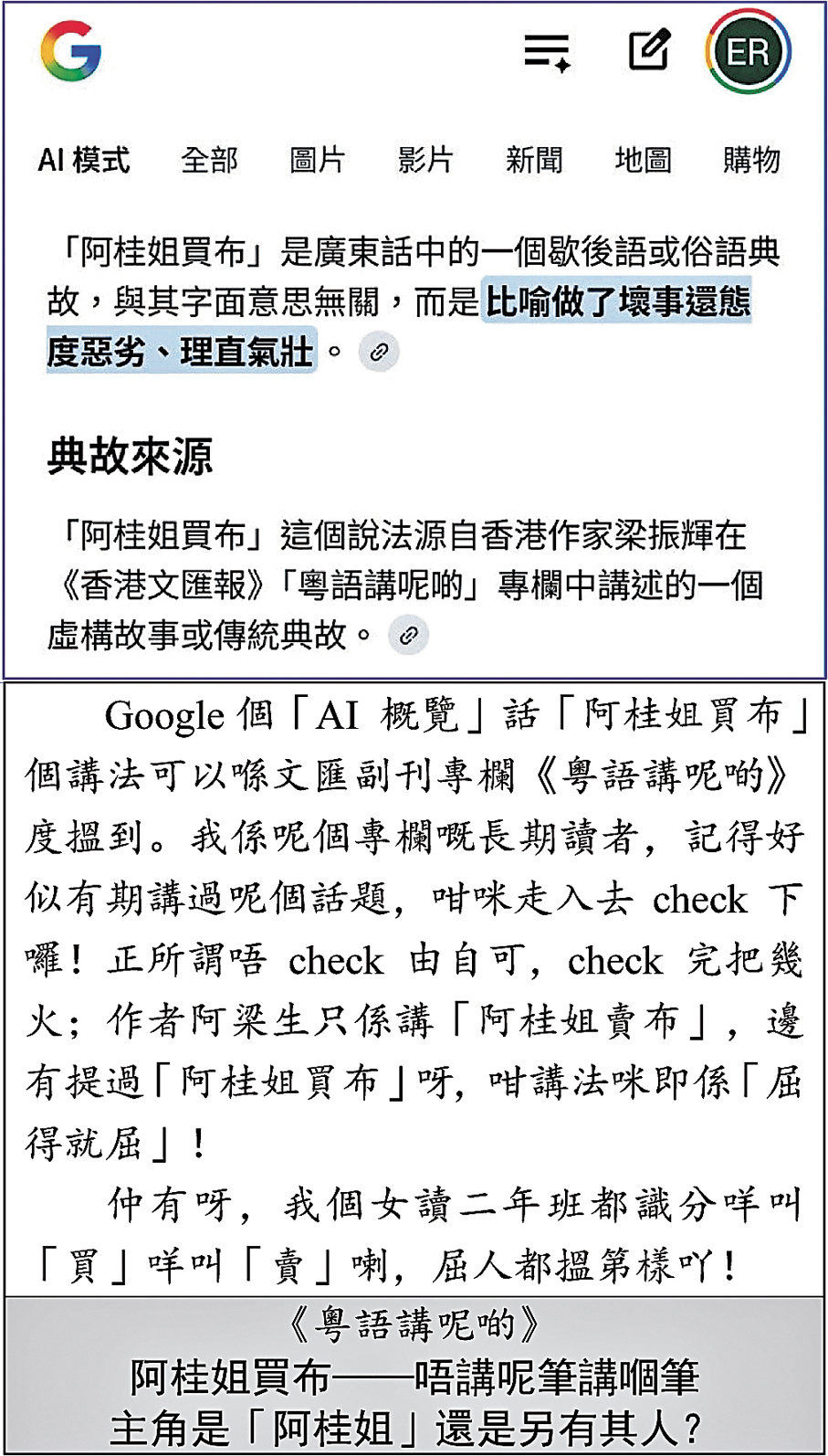 如所周知,對於一些有記載的事物真相,找AI回答就最便捷妥當。然而當遇上一些「似是而非」且給人們在網上廣泛流傳的資料,AI暫無那個邏輯思維去為大家辨識了!為了滿足用家千奇百怪的提問,且要顯示內在的超然能力,AI普遍用上了「大膽假設、不怎求證」甚或「移花接木、無中生有」等不實手法去回應。所謂「一節見則百節知」,上述OpenAI「暗度陳倉」的情節不可能是個別事件,而這也揭示了AI業界亂象叢生的冰山一角。上圖中Google AI概覽捏造「阿桂姐買布」的說法源自筆者在文匯副刊專欄「粵語講呢啲」所載也屬相類亂象。作品能被知名AI青睞,本來是「光榮事」;可實情沒這回事,便變成「遺憾事」了。這種「屈得就屈」的行為正正為人類提供了一個極壞的範式,影響之深遠不容小覷。