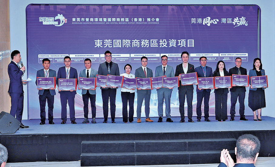 東莞市營商環境暨國際商務區(香港)推介會昨在港舉行,會上共完成16宗合作項目簽約,其中8宗項目進行現場簽約,涵蓋東莞國際商務區投資、莞港置業服務聯盟共建兩大核心板塊。東莞市副市長楊宇致辭時形容,莞港是大灣區相融相依、休戚與共的「親兄弟」,東莞製造的硬實力,是香港服務業最堅實、最廣闊的最佳「合夥人」,東莞營商的軟環境,是香港企業在內地發展最安心、最靠譜的「避風港」。