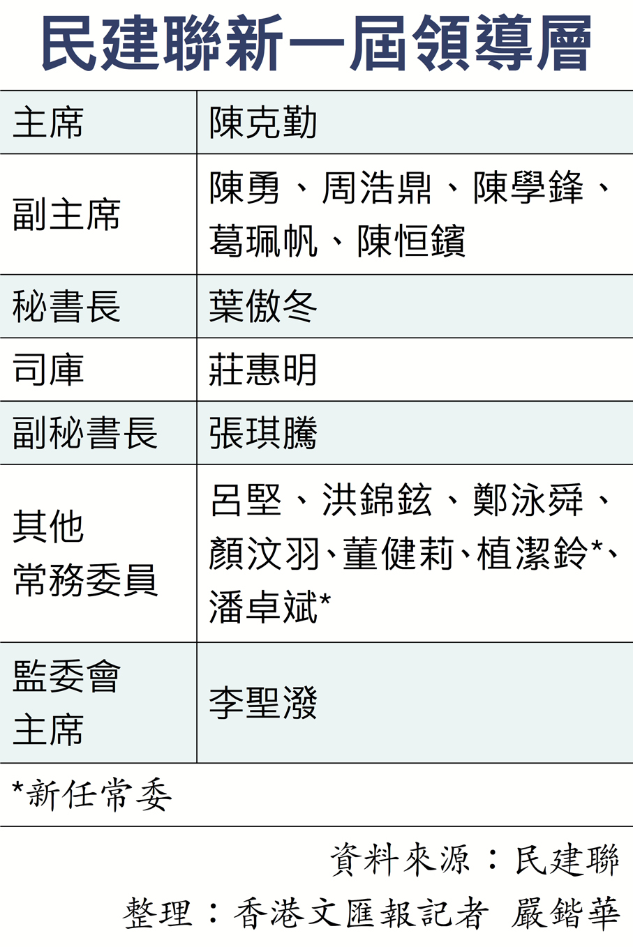 陳克勤昨日連任民建聯主席,民建聯5名現任副主席陳勇、周浩鼎、陳學鋒、葛珮帆、陳恒鑌均獲連任。