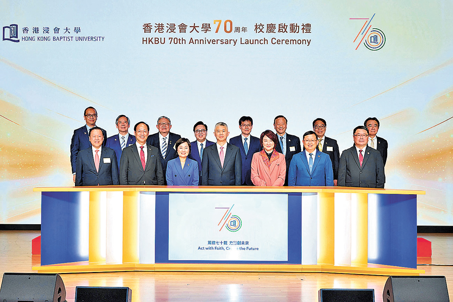 香港文匯報訊(記者 莫楠)香港浸會大學於昨日舉辦「70周年校慶啟動禮」,邀得中央人民政府駐香港特別行政區聯絡辦公室副主任孫尚武、特區政府立法會主席李慧琼、教育局局長蔡若蓮,以及大學教育資助委員會主席雷添良先生為主禮嘉賓,聯同浸大校董會暨諮議會主席黃英豪、副主席查毅超,以及校長衞炳江與超過300位嘉賓、師生、校友和浸大友好聚首校園,為大學及各院系部門於今年舉辦的一連串校慶活動正式揭開序幕。