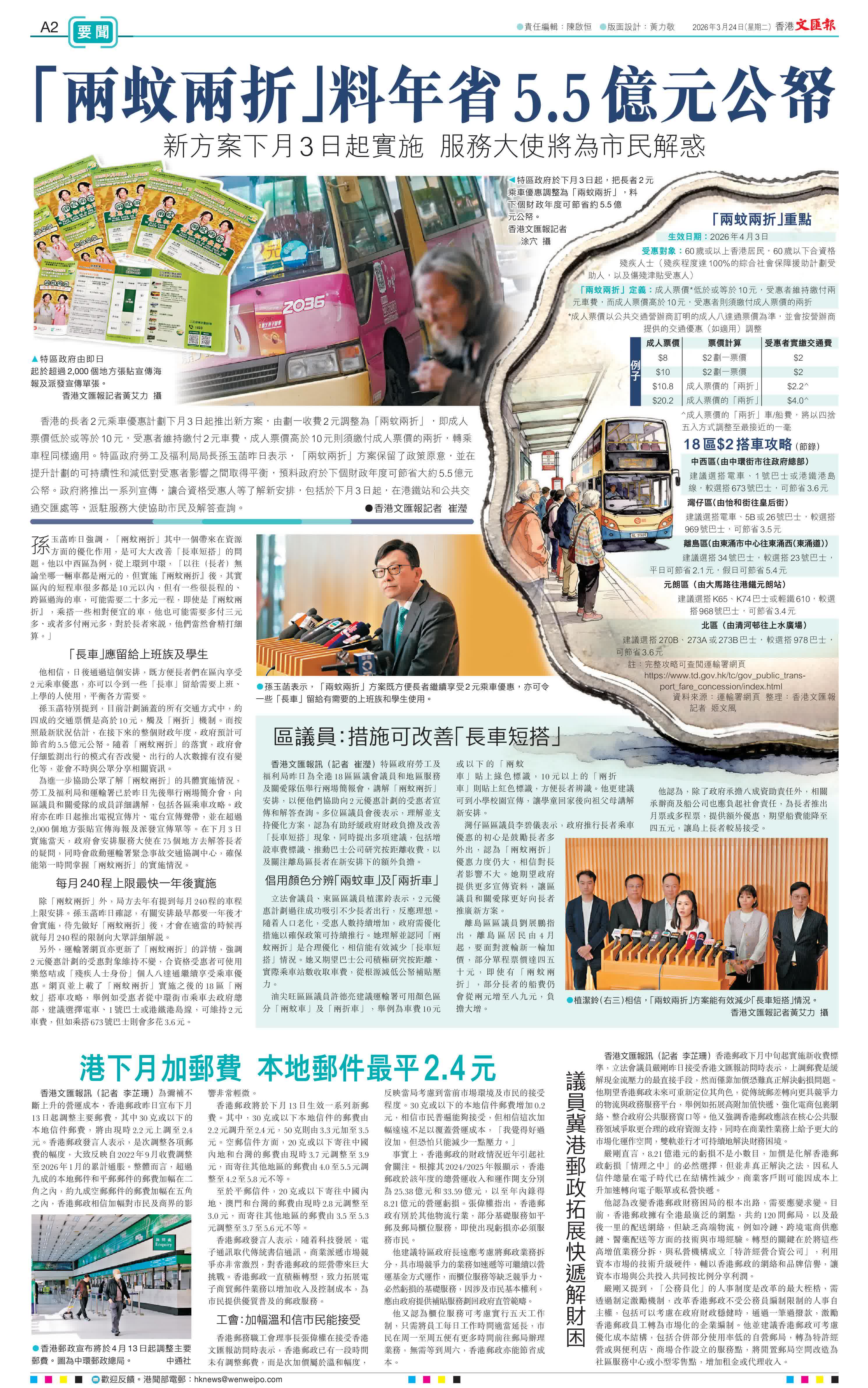 孫玉菡特別提到,目前計劃涵蓋的所有交通方式中,約四成的交通票價是高於10元,觸及「兩折」機制。而按照最新狀況估計,在接下來的整個財政年度,政府預計可節省約5.5億元公帑。隨着「兩蚊兩折」的落實,政府會仔細監測出行的模式有否改變、出行的人次數據有沒有變化等,並會不時與公眾分享相關資訊。