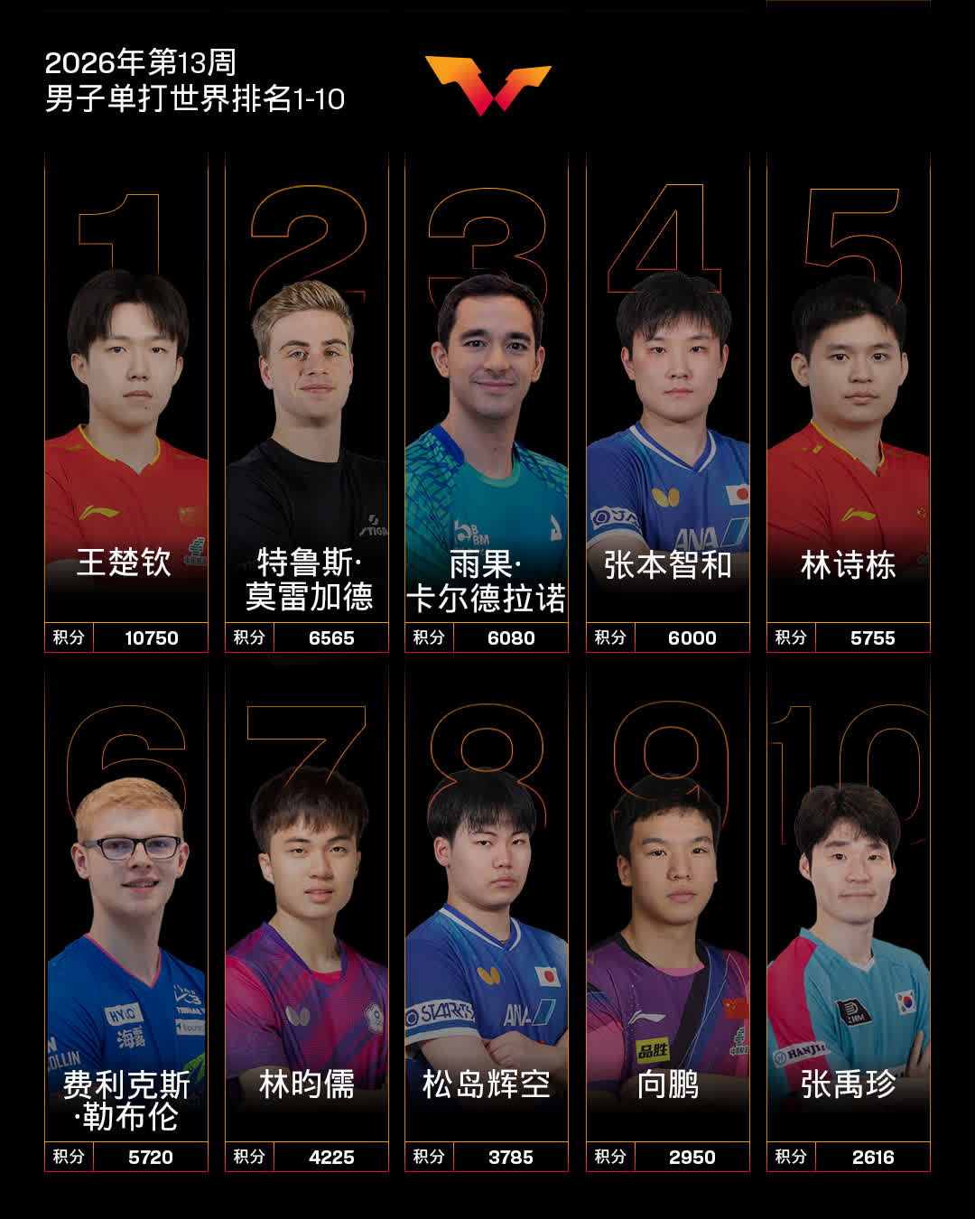 香港文匯網訊 國際乒聯2026年第13周世界排名出爐。男子單打,中國隊球員王楚欽位列第一,林詩棟位列第五,向鵬位列第九。