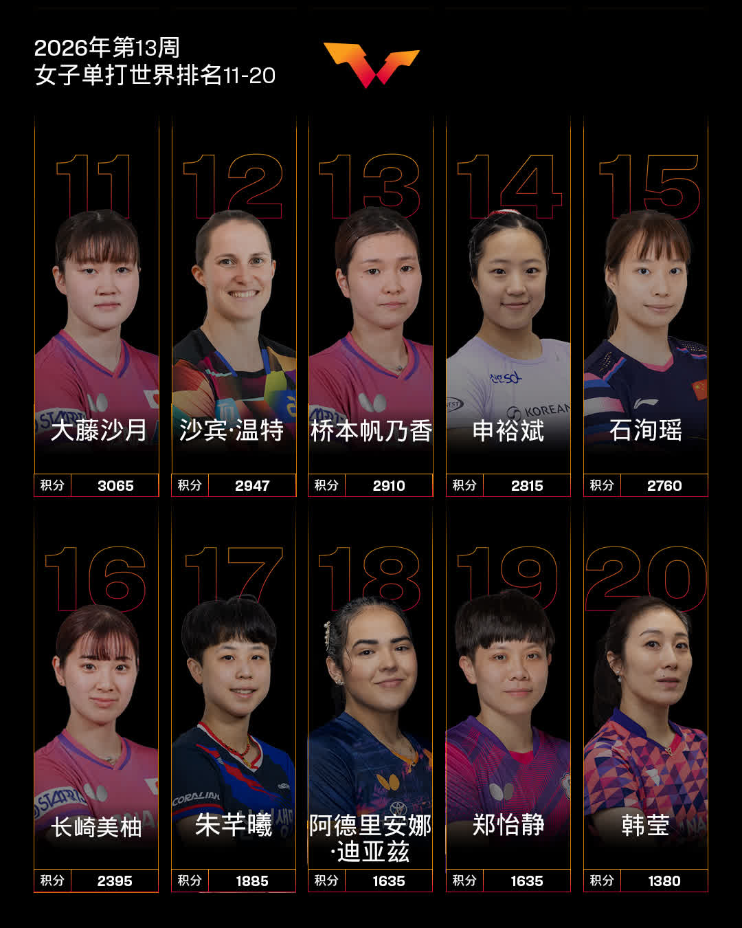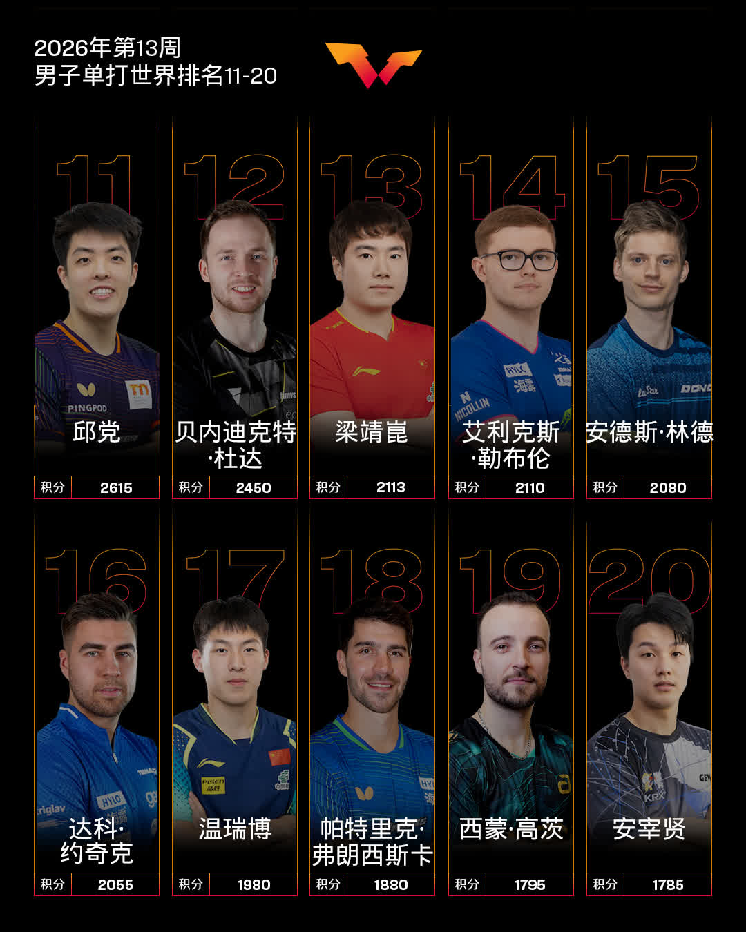 WTT支線賽瓦拉日丁站男單冠軍喬鮑·安德拉斯排名上升33個名次位列92,刷新個人職業生涯排名新高;亞軍濱田一輝排名上升6個名次位列47;四強埃斯特班·多爾排名上升32個名次位列128;四強胡安·佩雷斯排名上升30個名次位列141。