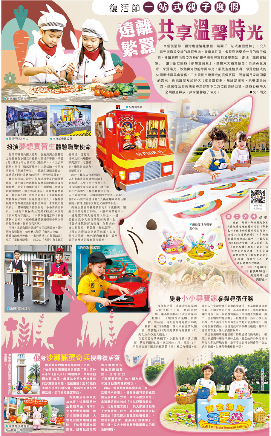 今個復活節,留港也能遠離繁囂,展開「一站式度假體驗」,投入陽光與海浪交織的度假天地,盡享集住宿、餐飲與玩樂於一身的親子假期。建議旅程由挪亞方舟的親子探索與寓教於樂開始,走進「職感實驗室」,讓小朋友變身「夢想實習生」,體驗六大職業使命;再到黃金海岸,享受陽光、沙灘與海浪的悠閒時光;最後走進愉景灣,感受歐陸式的休閒風情與美食饗宴。三大景點串連而成的度假旅程,既能滿足家庭同樂的需求,也能讓朋友或伴侶共享浪漫時刻。無論是探索、玩樂還是放鬆,這個復活節假期都將為你留下全方位的美好回憶,讓身心在海天之間徹底釋放,共享溫馨親子時光。