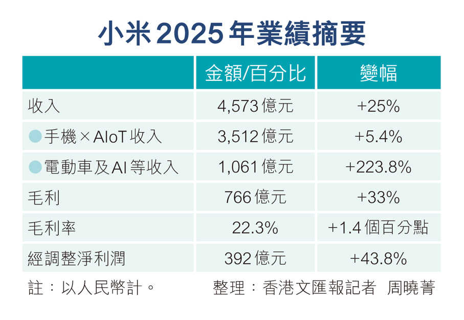 小米稱,2025年是智能電動汽車及AI等創新業務的首個完整年度,全年收入達1,061億元,按年大增223.8%,錄得經營收益9億元。單計第四季收入達372億元,按年升123.4%,收入佔比達31.8%。小米汽車全年共交付411,082輛,其中第四季度交付145,115輛。2026年將全力衝刺交付55萬輛的目標。