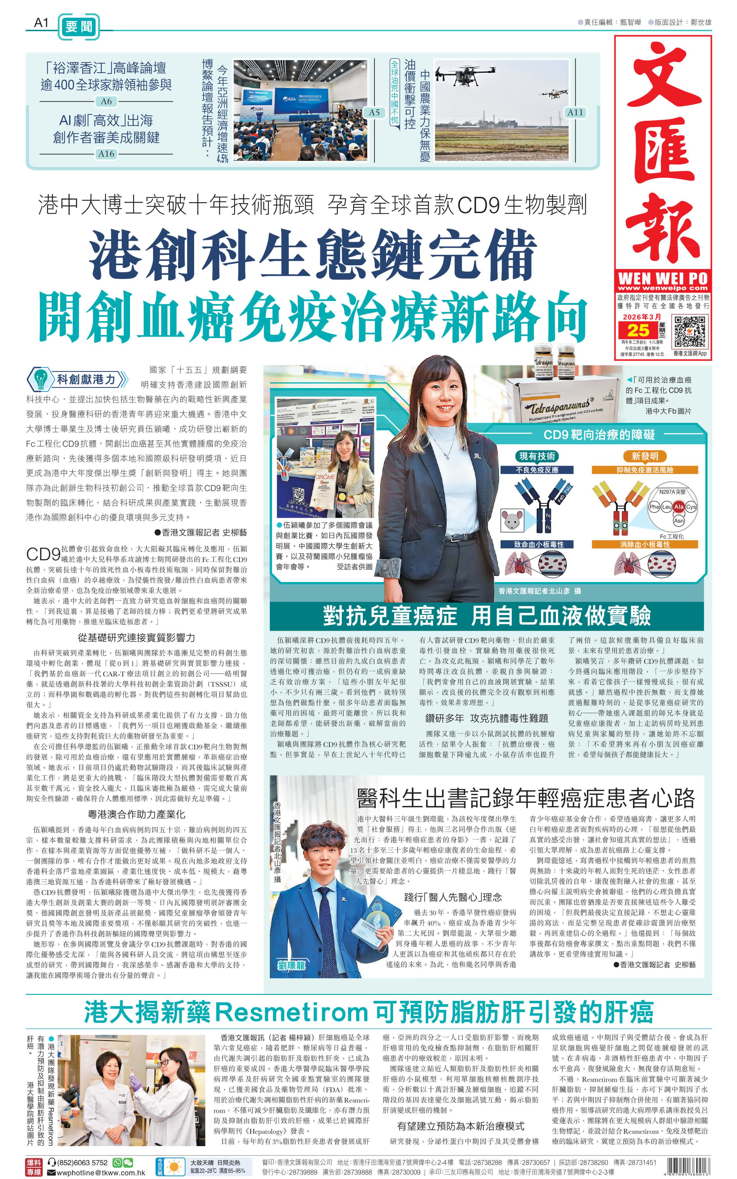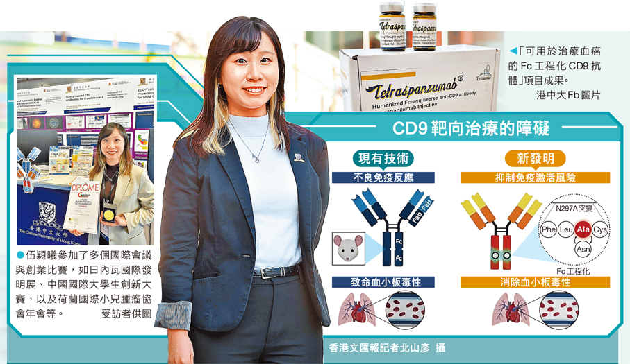 (香港文匯報記者 史柳藝)國家「十五五」規劃綱要明確支持香港建設國際創新科技中心,並提出加快包括生物醫藥在內的戰略性新興產業發展,投身醫療科研的香港青年將迎來重大機遇。香港中文大學博士畢業生及博士後研究員伍穎曦,成功研發出嶄新的Fc工程化CD9抗體,開創出血癌甚至其他實體腫瘤的免疫治療新路向,先後獲得多個本地和國際級科研發明獎項,近日更成為港中大年度傑出學生獎「創新與發明」得主。她與團隊亦為此創辦生物科技初創公司,推動全球首款CD9靶向生物製劑的臨床轉化,結合科研成果與產業實踐,生動展現香港作為國際創科中心的優良環境與多元支持。
