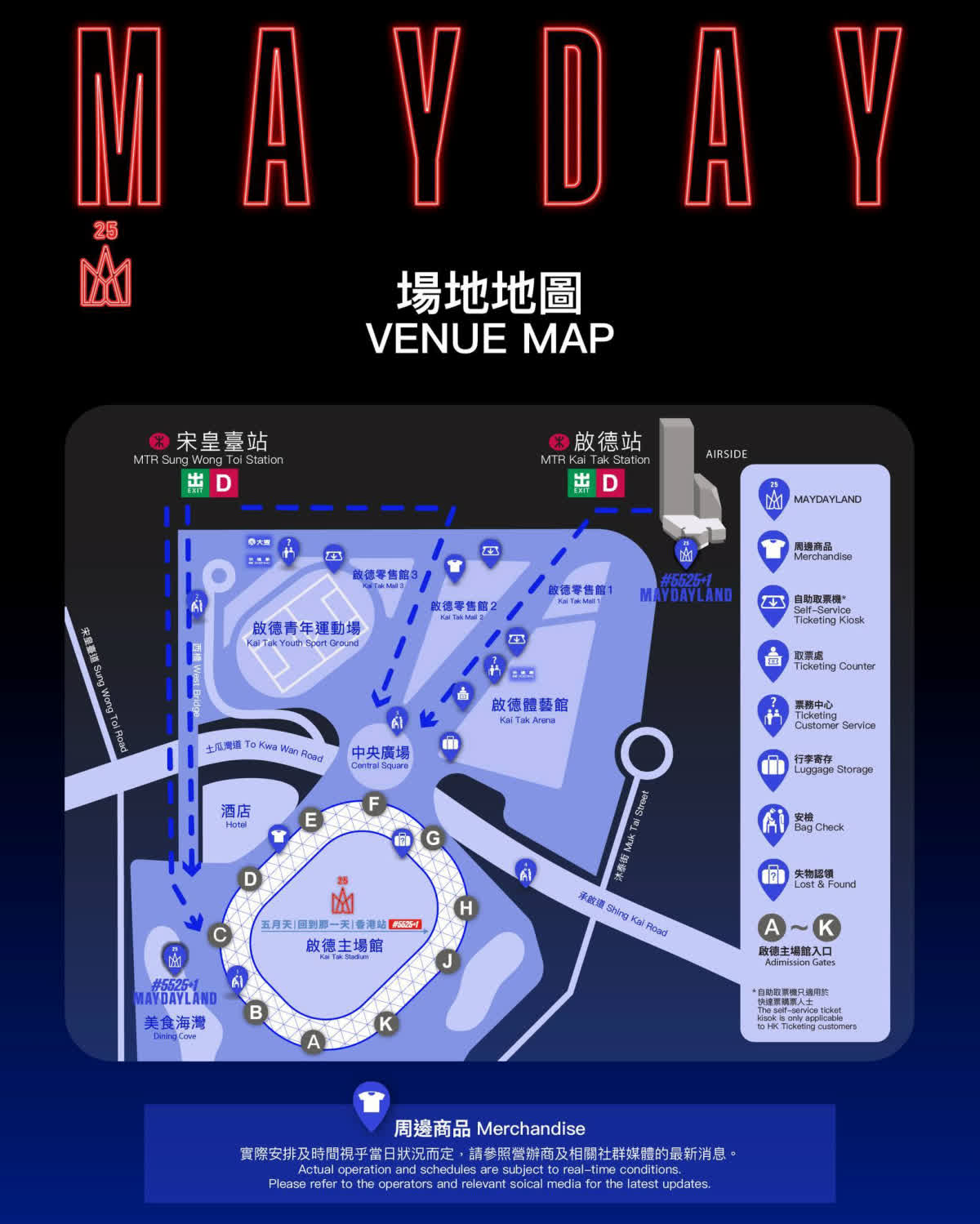 為方便「五迷」慶祝五月天成團29周年的重要時刻,體育園內有不同應援活動,希望能為「五迷」打造沉浸式應援體驗。其中,官方商品售賣處分別位於啟德主場館2樓啟慶匯及啟德零售館2地下中庭。園區內亦設置限定應援活動及主題打卡裝置。部分活動已於3月20日開始,「五迷」可留意主辦單位社交平台最新公布。