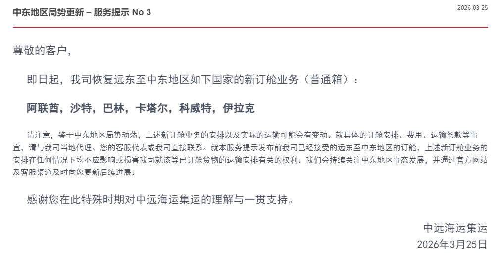 此前,中遠海運集運在3月4日曾發布服務提示稱:鑒於中東地區衝突持續升級,霍爾木茲海峽海上交通受到相應限制,為最大程度保障您的貨物運輸安全及整體航運運營的穩定性,根據中遠海運集運最新的風險評估結果,現決定即日起暫停相關航線新訂艙業務,恢復時間另行通知為止。