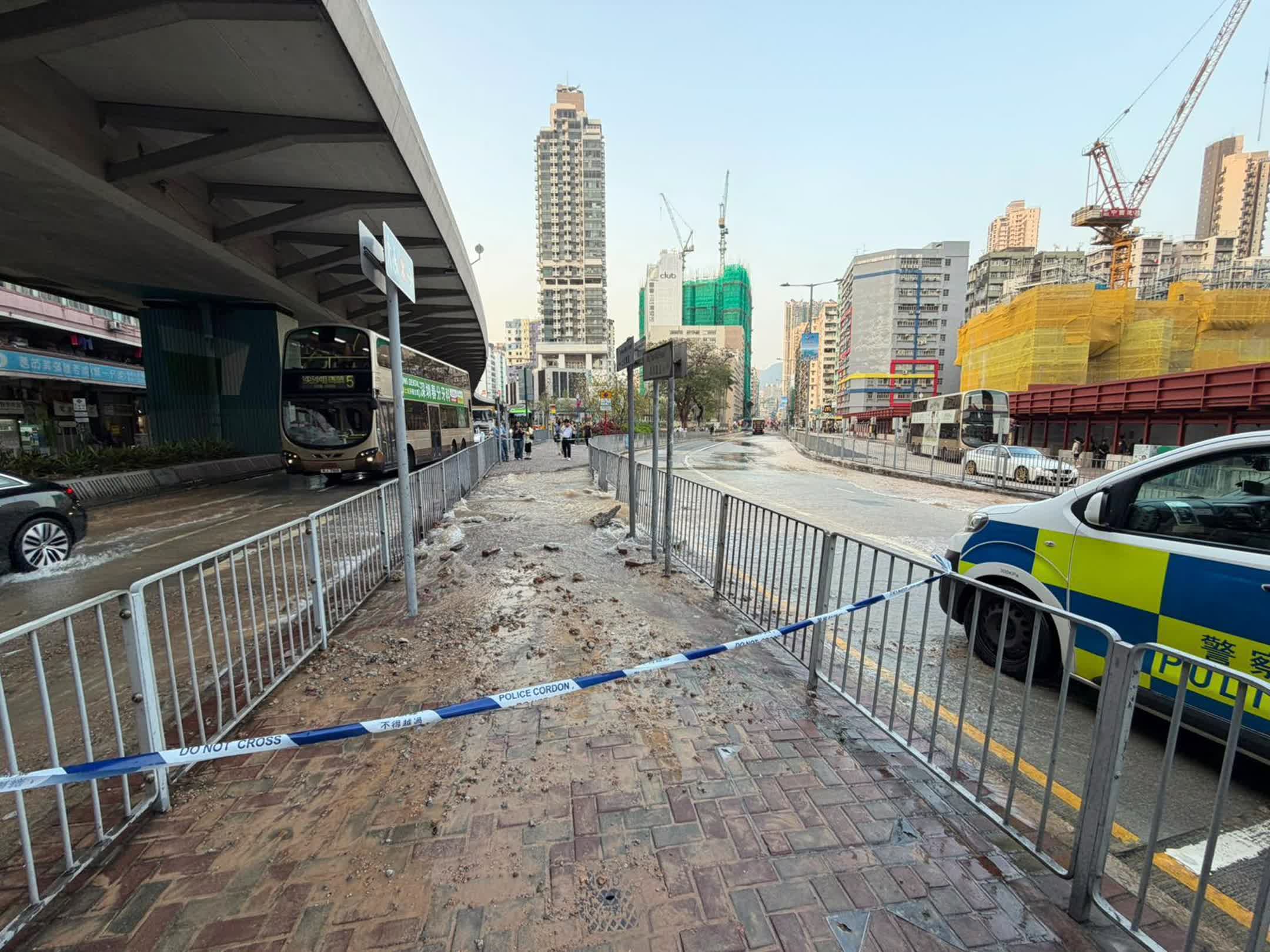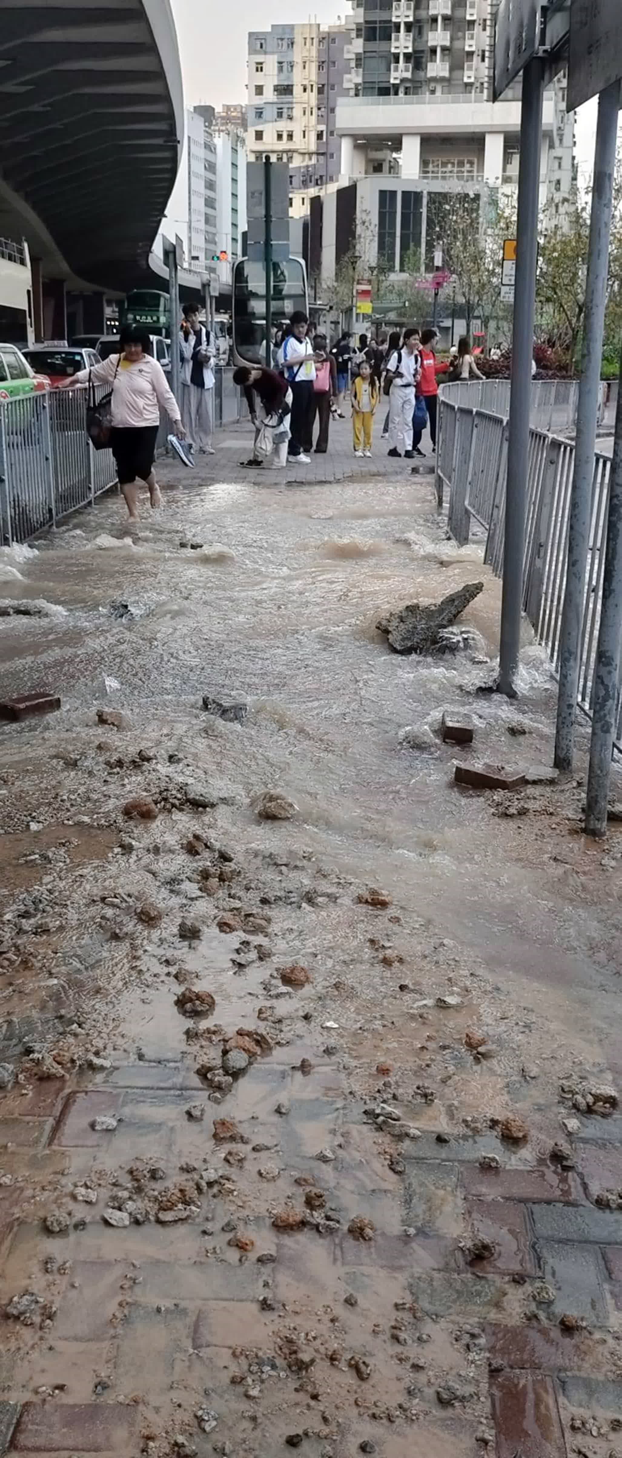 香港文匯報訊(記者 蕭景源)今日(25日)傍晚近6時,土瓜灣道近浙江街遊樂場巴士站有地底食管爆裂,大量黃泥水湧出沖毀路面,現場一段行人路及馬路頓成澤國,途人及車輛要涉水而行。警員其後接報到場封路及指揮交通,並通知水務署派員關上水閘和搶修,期間有區內關愛隊及議員到場協助途人。