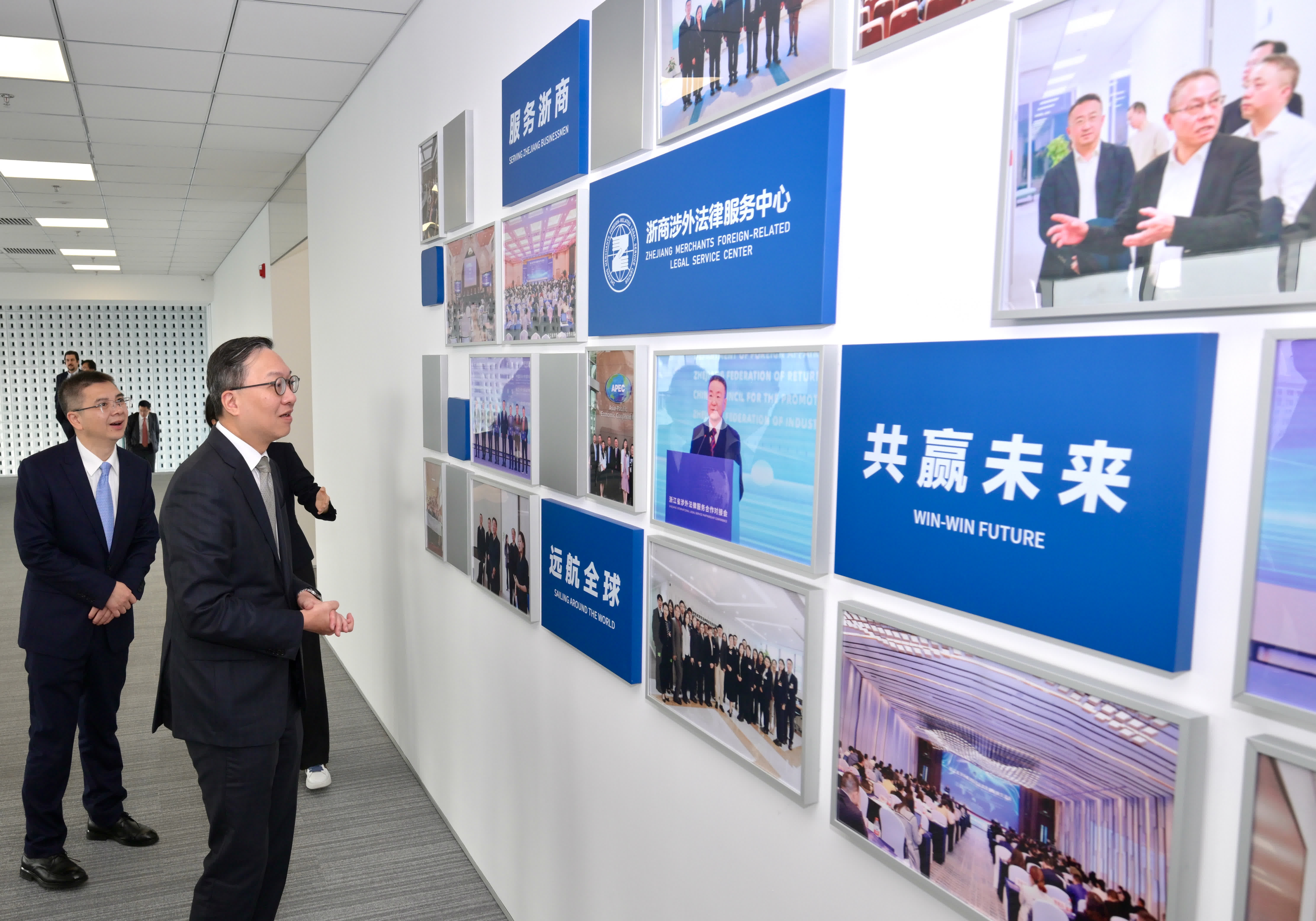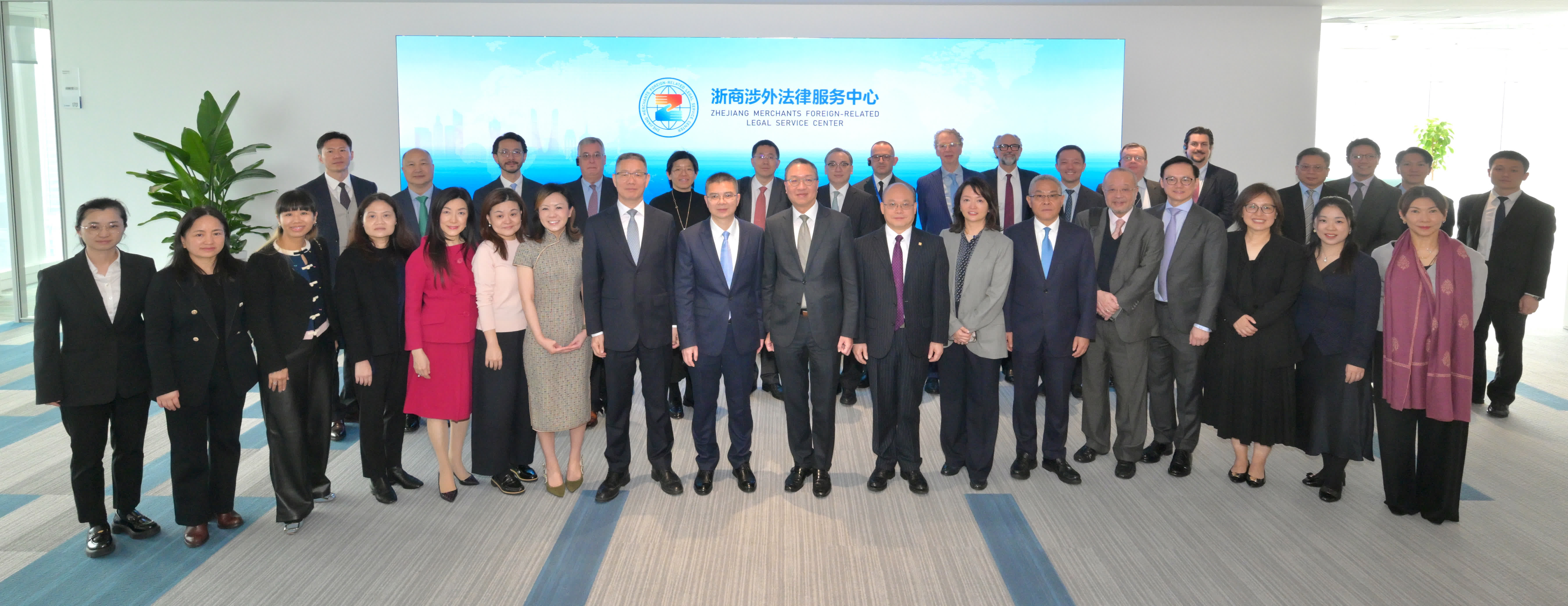 代表團又出席了與浙江省法律界代表的交流座談會。林定國與浙江省司法廳黨委副書記、副廳長勞泓首先交流討論香港法律界與浙江省法律界合作事宜。其後,浙江法律界代表在會上介紹和內地企業出海形式和最新趨勢,以及相關常見的法律和風險管控問題,而香港法律界代表則講述香港法律專業在協助企業出海的獨特角色。雙方亦探討加強兩地法律界、仲調界的專業合作,共同助力內地企業出海,並討論兩地涉外法律人才交流培訓的合作。