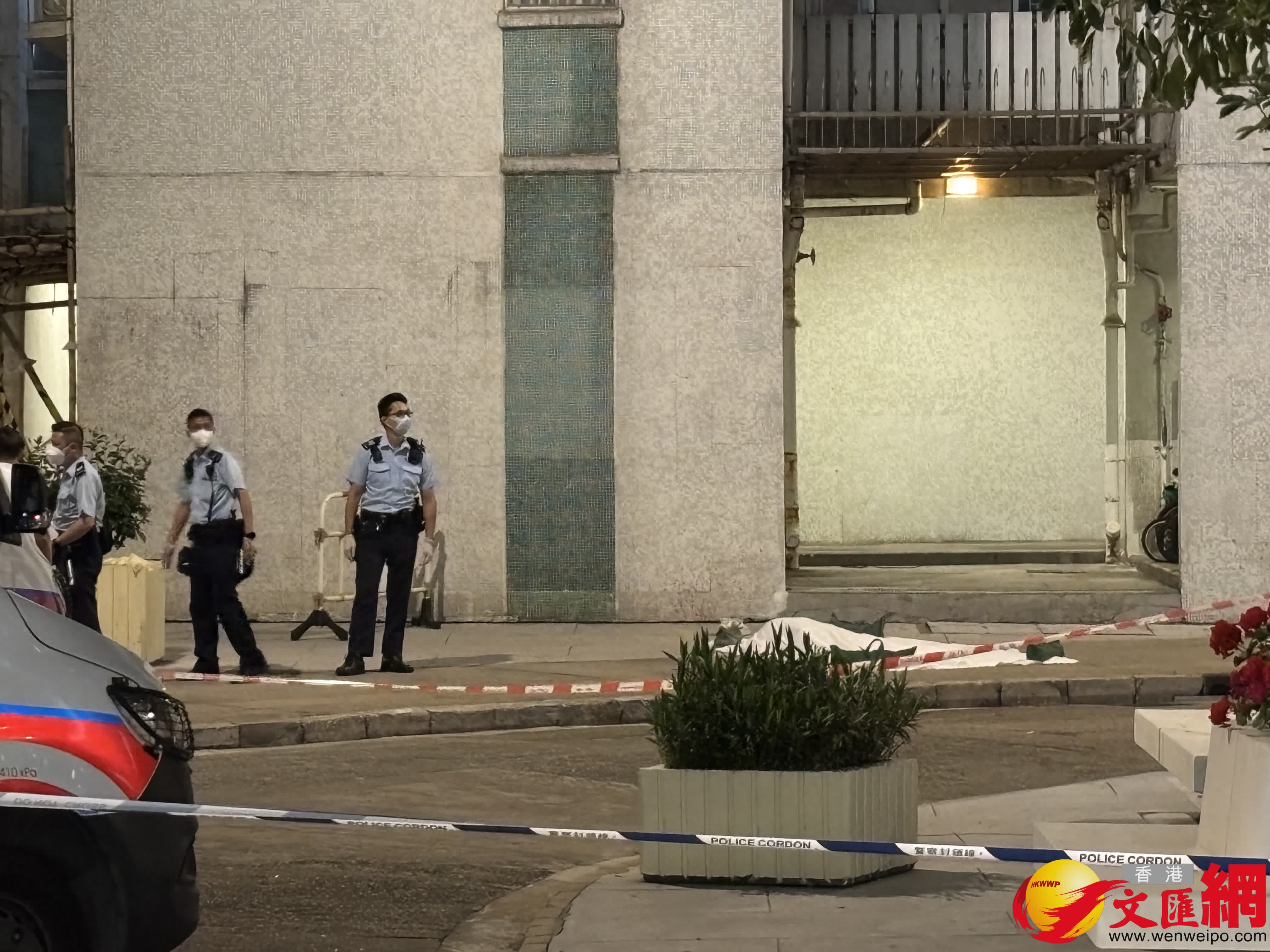 晚上9時許,記者在現場見到有1輛救護車和3輛警車到場,有一名懷疑是事主親友的男子,邊行走邊抹淚由救護和警員進行安慰。在沙田第一城21座樓底,記者見到疑似被白布遮蓋的遺體,現場警方拒絕透露進一步信息。