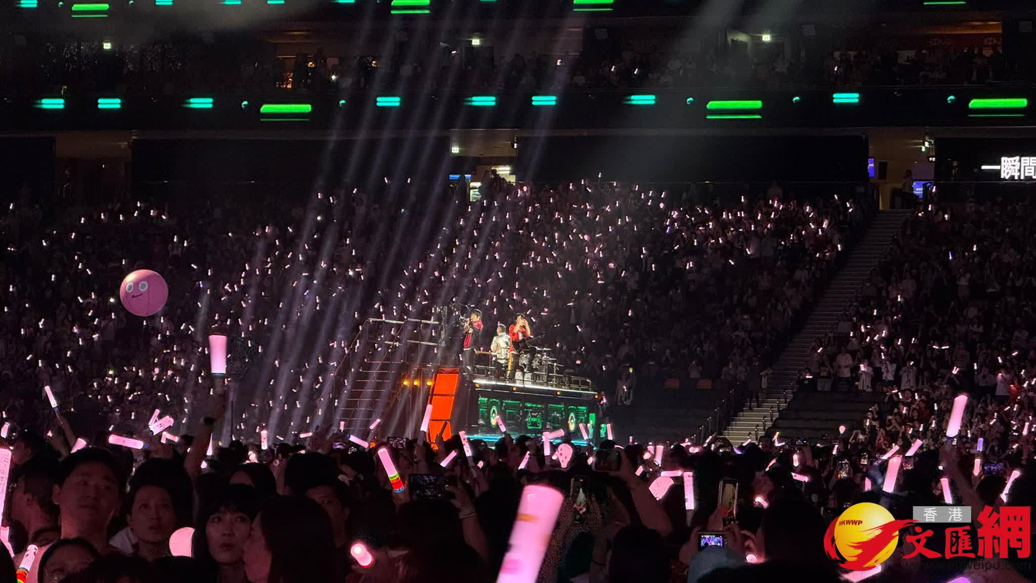 香港文匯報訊(記者 子棠、孫嘉蔚)台灣樂團五月天繼昨晚為粉絲舉行「綵排特別場」先睹為快,今晚在啟德主場館正式為合共4場的《#5525+1 回到那一天》香港站演唱會開鑼。五月天生日在即(3月29日「成團日」),五子特別以菠蘿包砌成生日蛋糕、以周杰倫送贈的飲品,與全場數萬人舉杯祝酒合唱生日歌慶祝:阿信還搞笑地邊吃包邊唱歌。而瑪莎就讓一對仔女粉墨登場,一家三口合力幻化五月天與恐龍共舞,將侏羅紀帶進場館變成MAYDAY LAND。