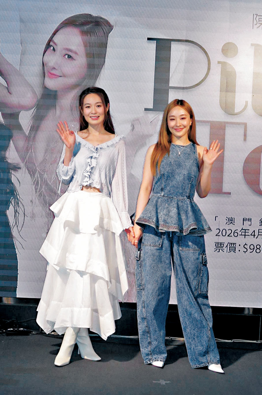 香港文匯報訊(記者 阿祖)陳瀅與蔡潔將於4月25日在澳門舉行一場《Pillow Talk》粉絲見面會,在昨日的發布會上,獲黎耀祥、陳山聰、黃宗澤、胡定欣及朱敏瀚拍片支持。陳瀅表示極度後悔接了這個騷,因她有舞台恐懼,對演出live毫無信心,起初接下這工作也怕與蔡潔意見不合而吵架,幸好現在她倆從未嗌過一次交,就連昨日出席發布會,在沒夾過的情況下齊齊戴了同一對耳環,連服裝顏色都很合襯,十分合拍。