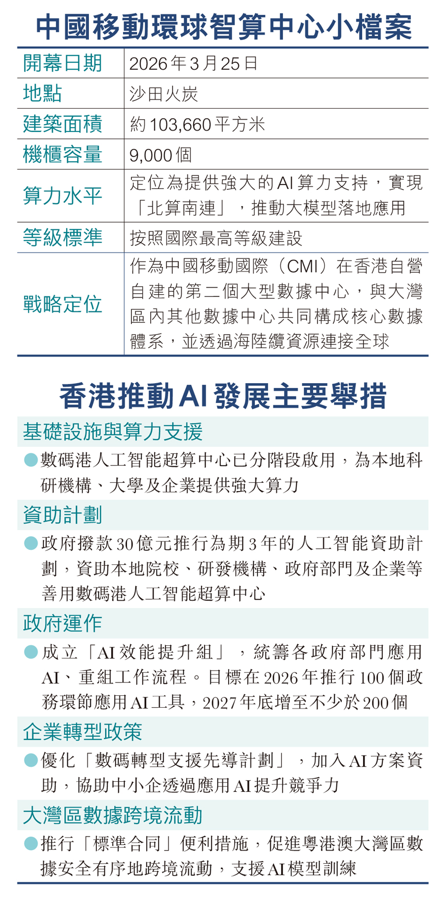 中國移動(0941)子公司中國移動國際昨日在香港舉行「環球智算中心開幕典禮」,標誌着該集團構建全球算力網絡布局邁出里程碑一步。環球智算中心位於沙田火炭,作為香港單體規模最大的旗艦智算中心,可支撐千億級參數大模型訓練推理,目標是成為香港數智創新新地標,助力香港打造成為國際創新科技中心,持續提升香港的國際競爭力。