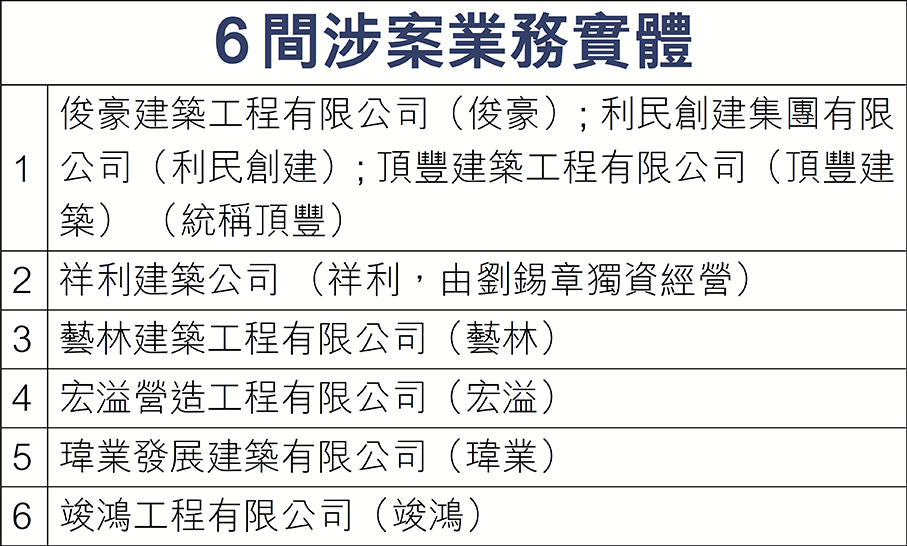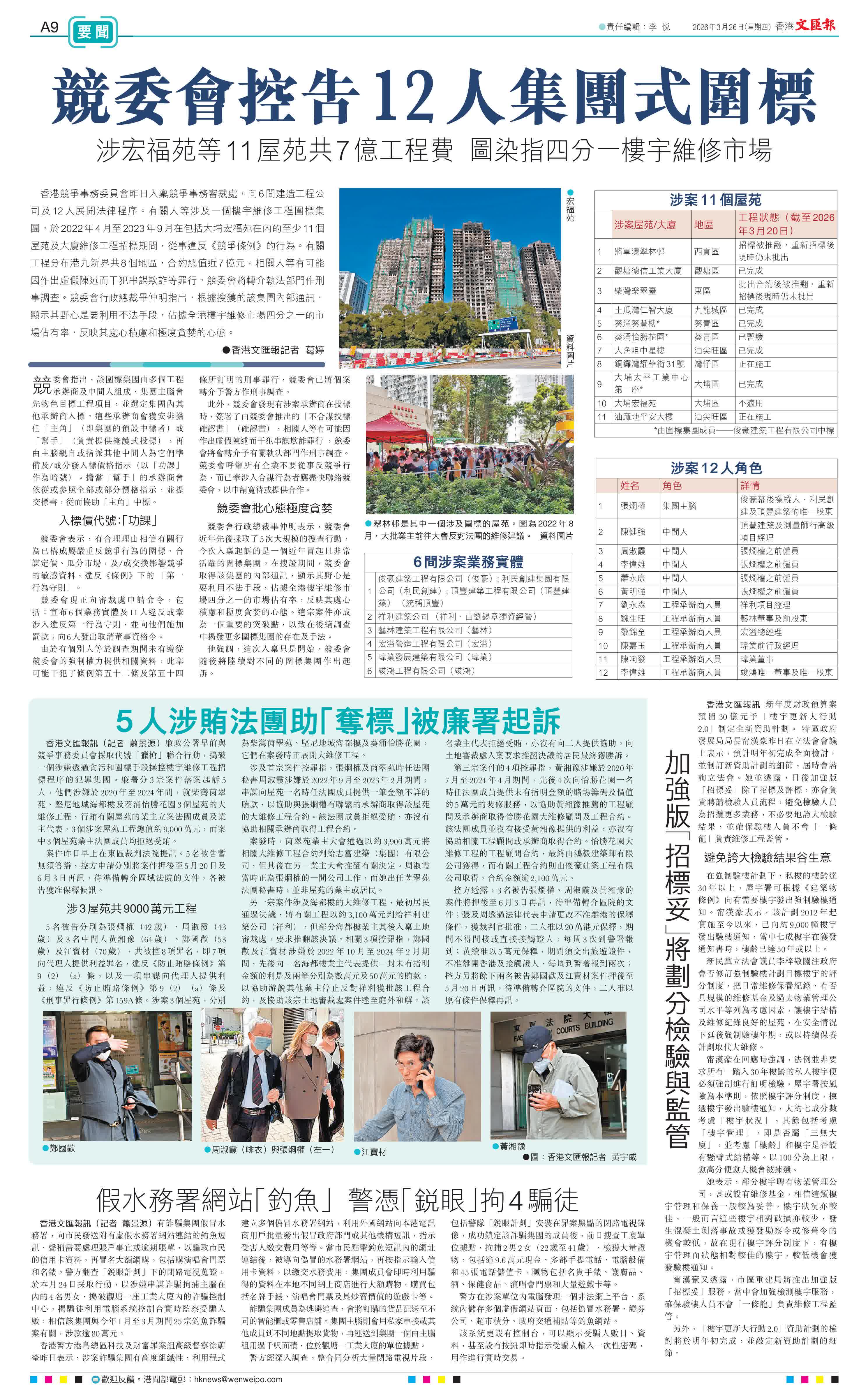 (香港文匯報記者 葛婷)香港競爭事務委員會昨日入稟競爭事務審裁處,向6間建造工程公司及12人展開法律程序。有關人等涉及一個樓宇維修工程圍標集團,於2022年4月至2023年9月在包括大埔宏福苑在內的至少11個屋苑及大廈維修工程招標期間,從事違反《競爭條例》的行為。有關工程分布港九新界共8個地區,合約總值近7億元。相關人等有可能因作出虛假陳述而干犯串謀欺詐等罪行,競委會將轉介執法部門作刑事調查。競委會行政總裁畢仲明指出,根據搜獲的該集團內部通訊,顯示其野心是要利用不法手段,佔據全港樓宇維修市場四分之一的市場佔有率,反映其處心積慮和極度貪婪的心態。