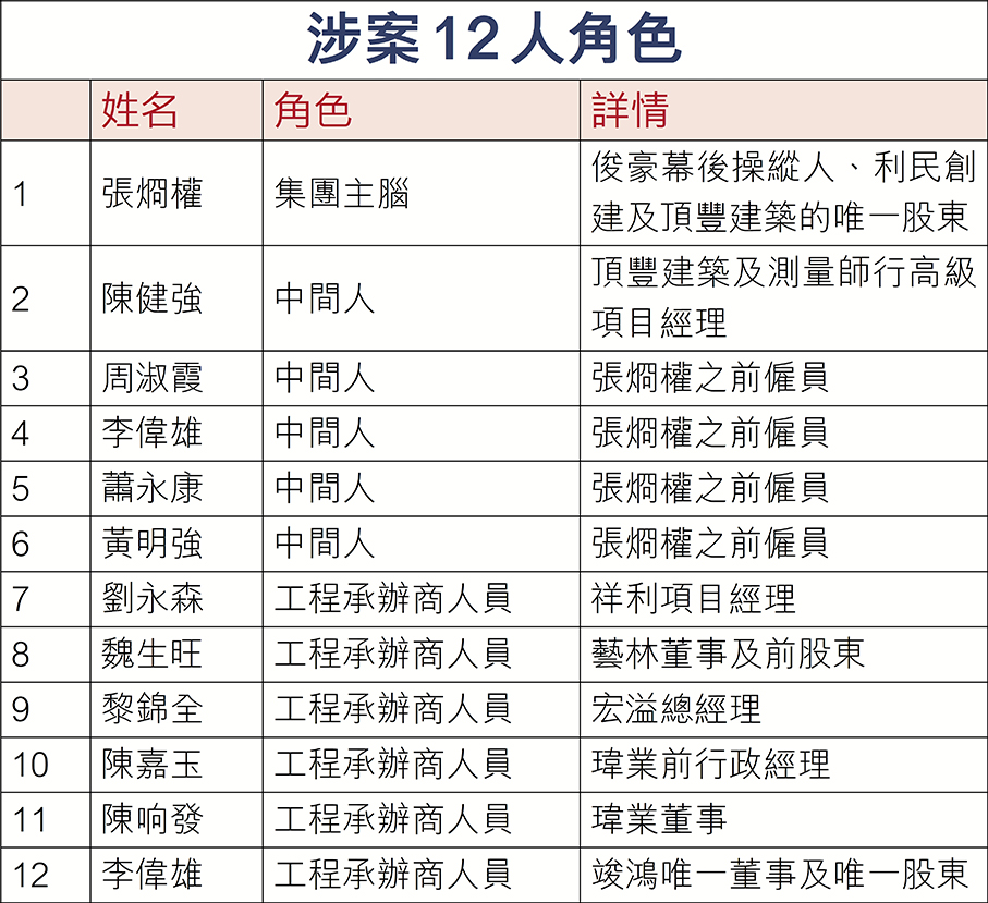 5名被告分別為張烱權(42歲)、周淑霞(43歲)及3名中間人黃湘豫(64歲)、鄭國歡(53歲)及江寶材(70歲),共被控8項罪名,即7項向代理人提供利益罪名,違反《防止賄賂條例》第9(2)(a)條,以及一項串謀向代理人提供利益,違反《防止賄賂條例》第9(2)(a)條及《刑事罪行條例》第159A條。涉案3個屋苑,分別為柴灣茵翠苑、堅尼地城海都樓及葵涌怡勝花園,它們在案發時正展開大維修工程。