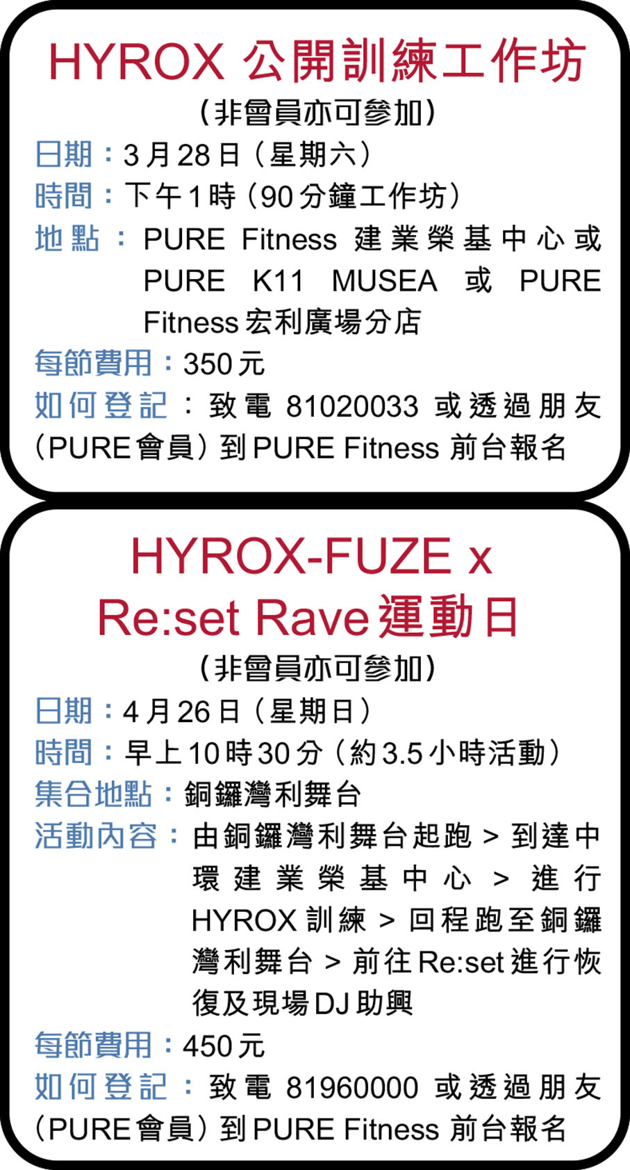 PURE於賽事舉行前推出HYROX專項訓練工作坊及訓練課程。課程由曾參與HYROX賽事的專業教練帶領,為新手與資深HYROX玩家、跑者以及健身愛好者提供針對性訓練。包括專注提升跑步耐力、建立功能性力量、適應疲勞下的動作轉換、重視靈活度與恢復、保持積極的心理狀態等五大方向,分別進行每節90分鐘訓練,令備戰更全面而高效。