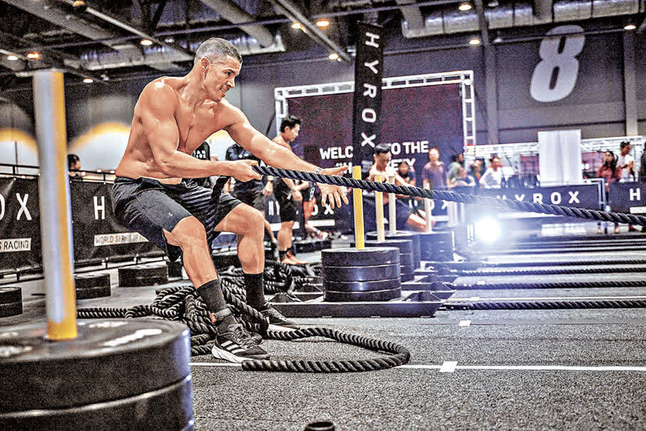 HYROX以「8公里跑步及8個功能性訓練站」的獨特賽制,全面考驗運動員的耐力、力量與意志力,吸引世界各地健身愛好者參加。參賽者每完成1公里跑步,就要進入特定訓練站,順序為:1000m滑雪機、50m推雪橇、50m拉雪橇、80m波比跳遠、1000m划船機、200m農夫走路、100m沙袋弓箭步,最後以100下牆球投擲結束。此賽制不僅吸引健身愛好者,眾多長跑、半馬拉松跑手及跨界運動愛好者亦紛紛挑戰,儼然成為香港健身界的年度焦點盛事。