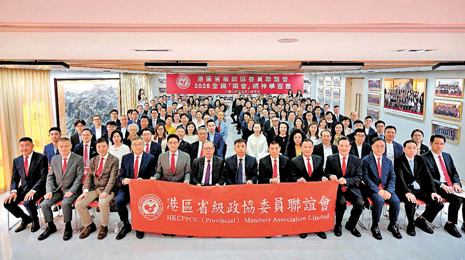 香港文匯報訊 港區省級政協委員聯誼會25日舉辦2026全國兩會精神學習會,通過會議宣講和資料研讀,委員們深入學習兩會精神,準確把握國家發展藍圖下香港的角色定位和中心任務,進一步明確聯誼會在助力香港對接「十五五」、融入和服務國家發展大局中的職責和方向。
