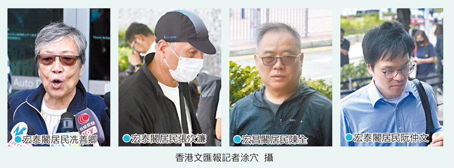 85歲的宏泰閣居民冼善卿憶述,颱風時窗外阻燃棚網未損壞,事後得知部分更換的新防護網較易燃,看到其他單位的新網燃燒猛烈,火警當日她原準備外出回收物品,開門即見電梯大堂飄出黑煙,遂立即以濕毛巾堵住門縫,趁單位仍有電力,開啟抽油煙機及抽氣扇協助排煙,同時打開窗戶並以風扇向外送風,盡量延緩濃煙滲入室內。她並曾以清水淋灑外牆竹棚,並用噴水壺噴灑她認為可能起火的位置。