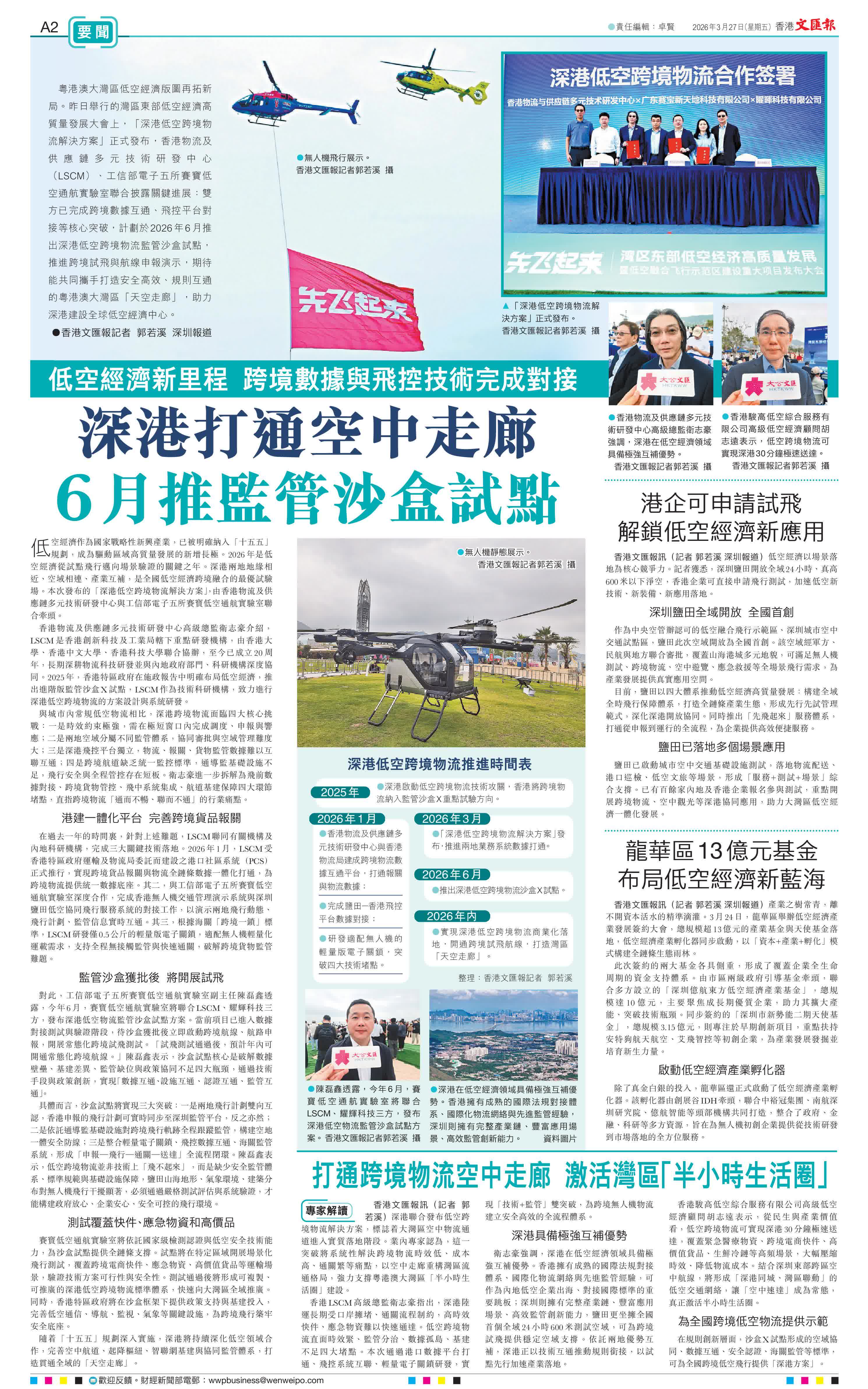 (香港文匯報記者 郭若溪 深圳報道)粵港澳大灣區低空經濟版圖再拓新局。昨日舉行的灣區東部低空經濟高質量發展大會上,「深港低空跨境物流解決方案」正式發布,香港物流及供應鏈多元技術研發中心(LSCM)、工信部電子五所賽寶低空通航實驗室聯合披露關鍵進展:雙方已完成跨境數據互通、飛控平台對接等核心突破,計劃於2026年6月推出深港低空跨境物流監管沙盒試點,推進跨境試飛與航線申報演示,期待能共同攜手打造安全高效、規則互通的粵港澳大灣區「天空走廊」,助力深港建設全球低空經濟中心。