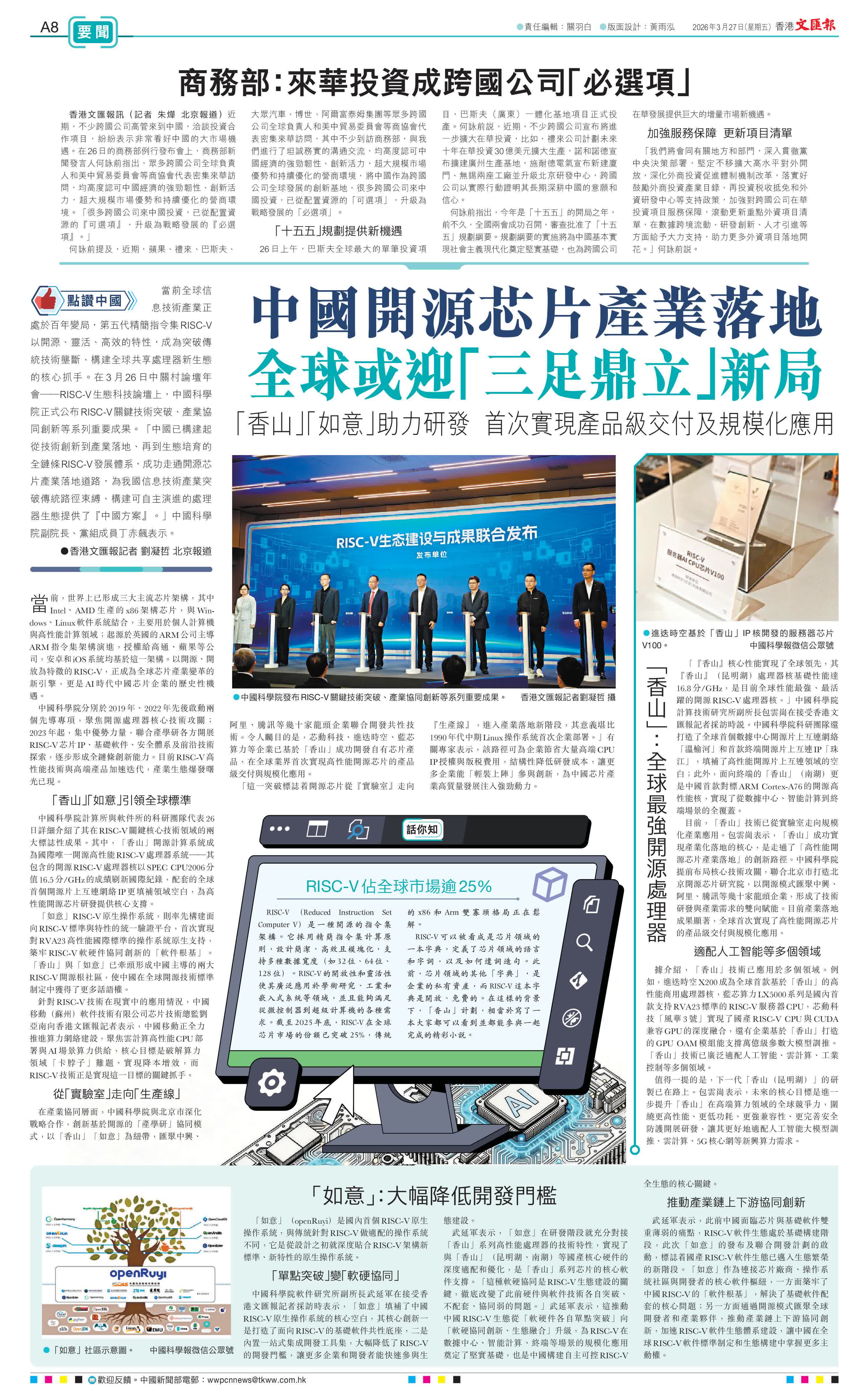 (香港文匯報記者 劉凝哲 北京報道)當前全球信息技術產業正處於百年變局,第五代精簡指令集RISC-V以開源、靈活、高效的特性,成為突破傳統技術壟斷、構建全球共享處理器新生態的核心抓手。在3月26日中關村論壇年會——RISC-V生態科技論壇上,中國科學院正式公布RISC-V關鍵技術突破、產業協同創新等系列重要成果。「中國已構建起從技術創新到產業落地、再到生態培育的全鏈條RISC-V發展體系,成功走通開源芯片產業落地道路,為我國信息技術產業突破傳統路徑束縛、構建可自主演進的處理器生態提供了『中國方案』。」中國科學院副院長、黨組成員丁赤飆表示。