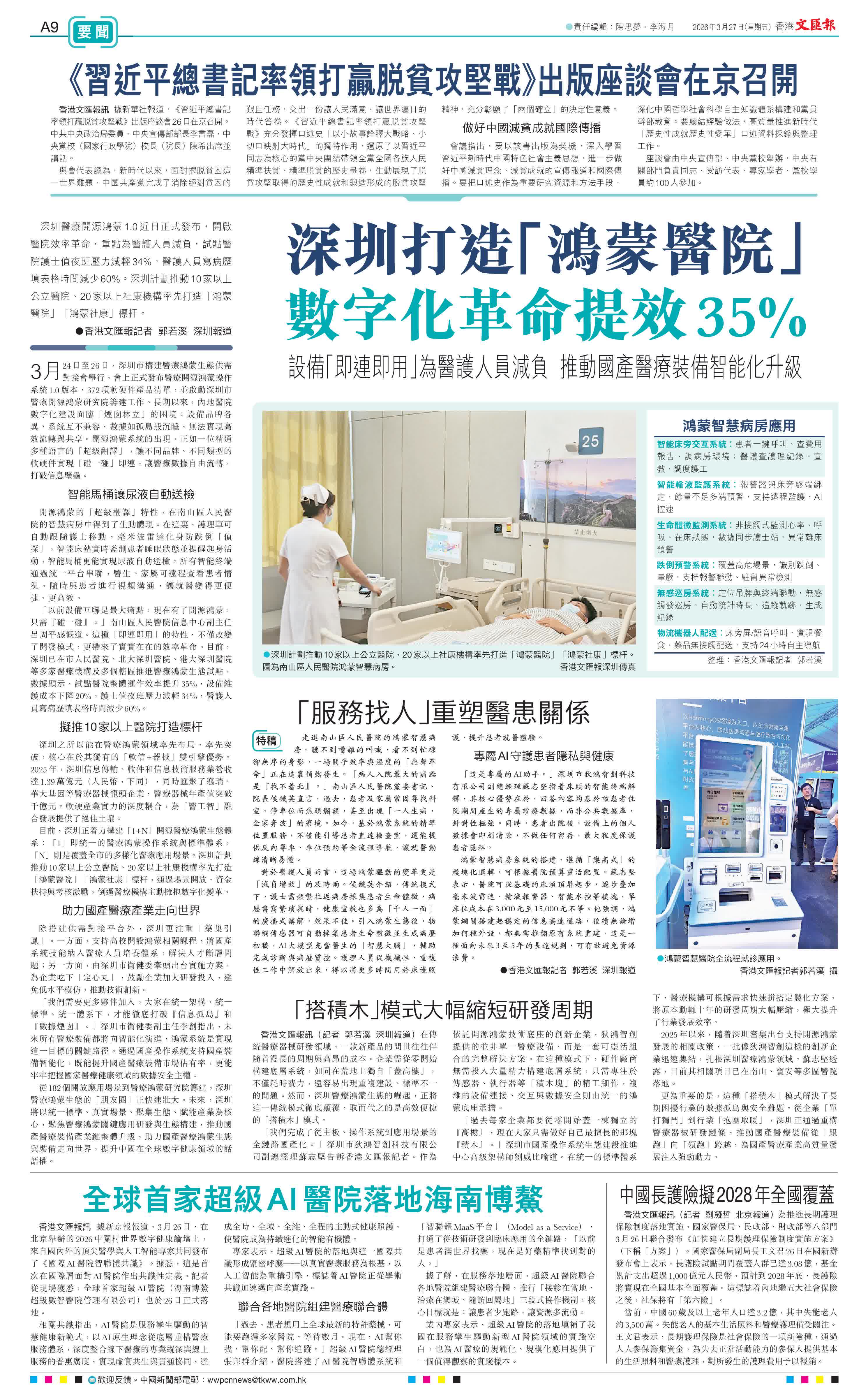 香港文匯報訊 據新京報報道,3月26日,在北京舉辦的2026中關村世界數字健康論壇上,來自國內外的頂尖醫學與人工智能專家共同發布了《國際AI醫院智聯體共識》。據悉,這是首次在國際層面對AI醫院作出共識性定義。記者從現場獲悉,全球首家超級AI醫院(海南博鰲超級數智醫院管理有限公司)也於26日正式落地。