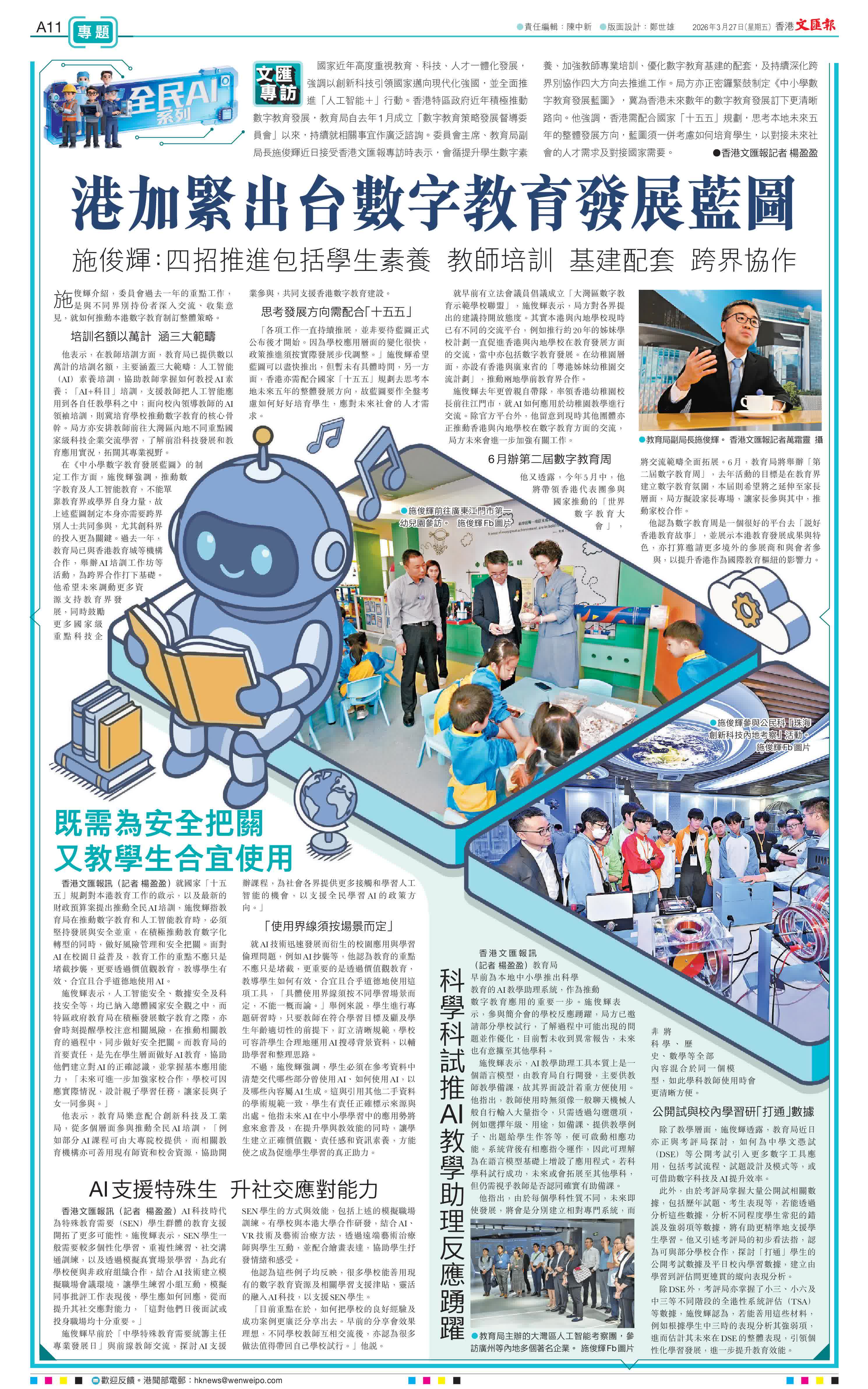 (香港文匯報記者 楊盈盈)國家近年高度重視教育、科技、人才一體化發展,強調以創新科技引領國家邁向現代化強國,並全面推進「人工智能+」行動。香港特區政府近年積極推動數字教育發展,教育局自去年1月成立「數字教育策略發展督導委員會」以來,持續就相關事宜作廣泛諮詢。委員會主席、教育局副局長施俊輝近日接受香港文匯報專訪時表示,會循提升學生數字素養、加強教師專業培訓、優化數字教育基建的配套,及持續深化跨界別協作四大方向去推進工作。局方亦正密鑼緊鼓制定《中小學數字教育發展藍圖》,冀為香港未來數年的數字教育發展訂下更清晰路向。他強調,香港需配合國家「十五五」規劃,思考本地未來五年的整體發展方向,藍圖須一併考慮如何培育學生,以對接未來社會的人才需求及對接國家需要。