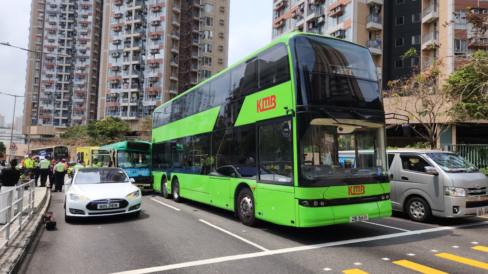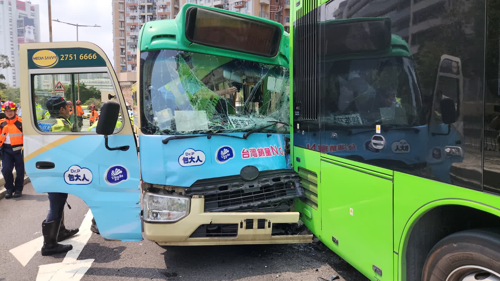 九巴發言人表示,下午近1時30分,一輛小巴站駛至小瀝源路近廣善街時,與一輛私家車相撞,並波及旁邊一輛九巴,巴士車尾受損,巴士上無人受傷。