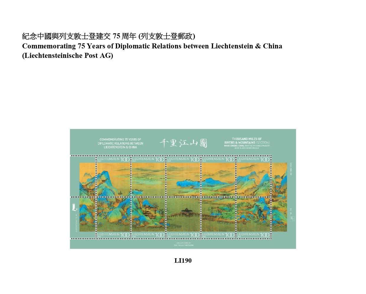 此外,列支敦士登郵政以「紀念中國與列支敦士登建交75周年」為題發行郵品。郵票設計選取《千里江山圖》中最精彩的一段,以兩排共十枚郵票的形式呈現。郵票以藝術為媒,旨在見證並弘揚中列兩國之間深厚的友誼與文化交流,共慶雙邊關係的發展,頌揚兩國共享的藝術瑰寶。
