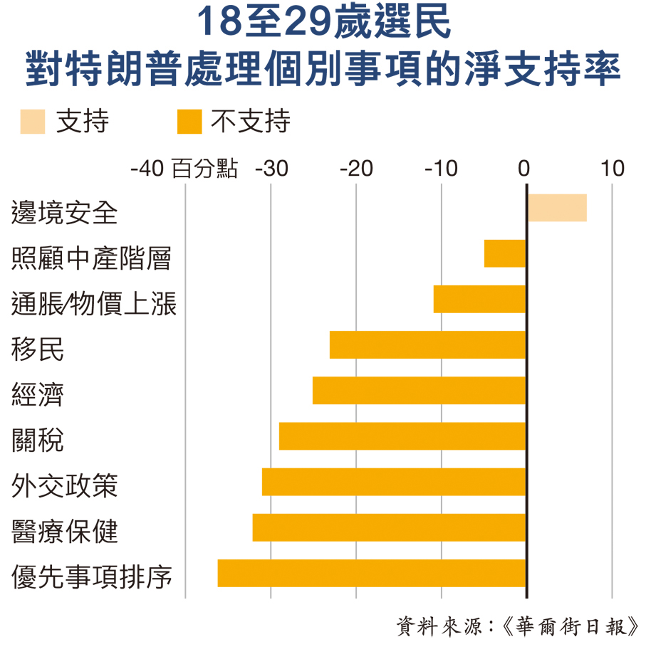 《華爾街日報》針對243名18歲至29歲的登記選民進行調查,要求他們對特朗普處理多項事務的表現給予「淨評分」,即贊成百分比減去不贊成百分比,結果顯示除「邊境安全」外,無一項獲得年輕選民認可。特朗普在「優先事項是否正確」上的淨支持率為-36%,成為年輕人最不滿的事項;在「醫療健康」、「外交政策」、「關稅」等議題上的淨支持率亦接近-35%;在通脹問題上則為-11%。此數據分布清晰顯示,年輕選民對特朗普政府的整體施政方向、具體政策手段及實際成效均感失望。