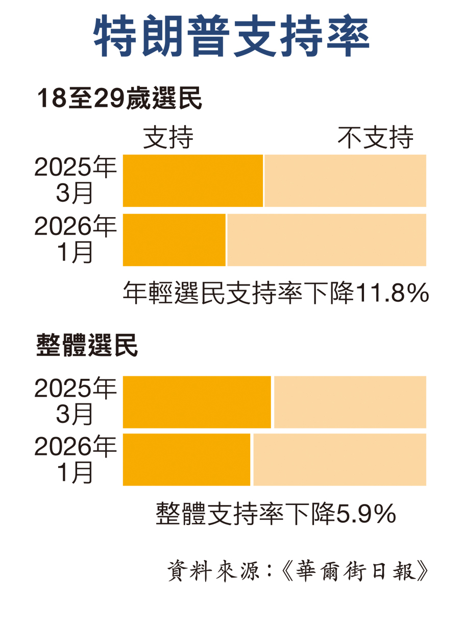 香港文匯報訊 美國《華爾街日報》最新民調數據顯示,美國年輕選民對總統特朗普的施政滿意度,自2024年大選後明顯下跌,尤其在外交政策、移民及經濟等關鍵議題上,不認同比例顯著上升。數據反映在特朗普重返白宮後,其執政重點背離大選時的承諾,與年輕一代的期望出現落差,將對共和黨在今年底的中期選舉構成壓力。 ●香港文匯報記者 路雨萱