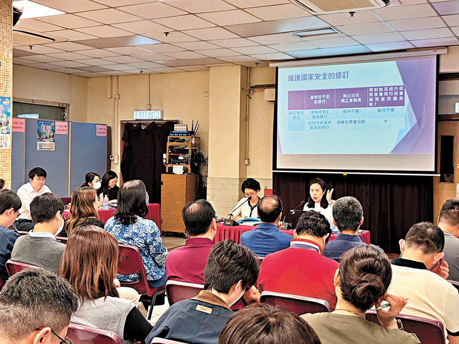 講座上,當局代表闡釋條例的主要修訂內容。新修訂條例與香港國安法和《維護國家安全條例》相輔相成,築牢國安屏障,保障工會免受危害國家安全行為的侵害。同時,條例切合本地工會現況,對合法合規的工會帶來正面作用,僱員參與工會的權利也受到保障。
