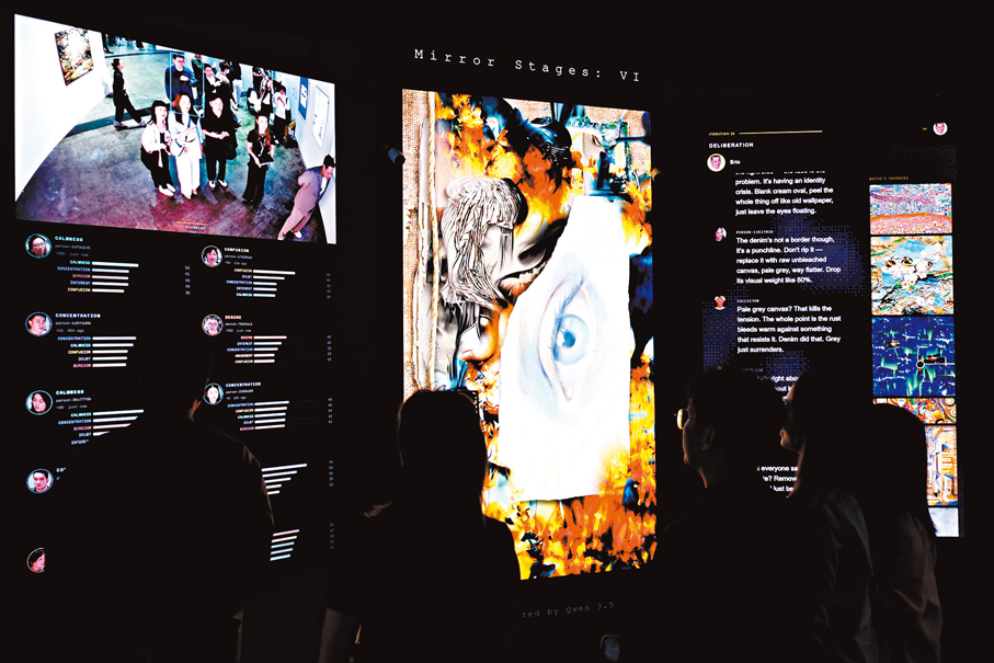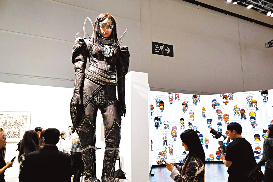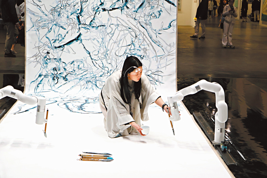 而展售現場的火熱氣氛也在在印證了市場數據的指向。香港文匯報記者在現場所見,藏家們在傳統繪畫與數碼裝置間穿梭,「Zero 10」展區內的大型互動作品前往往排起長隊。葉錦添高達4.5米的巨型人體雕塑《Lili》身披未來感太空衣,成為最受矚目的打卡點;華裔加拿大藝術家鍾愫君則與機械臂親密共創,展示人類創造力與人工智能協作的無限可能。這些作品不僅挑戰了傳統藝術形式,也讓收藏的對象發生了改變,藏家購買的不再只是具象的藝術品,而是一個持續演化的系統和體驗。