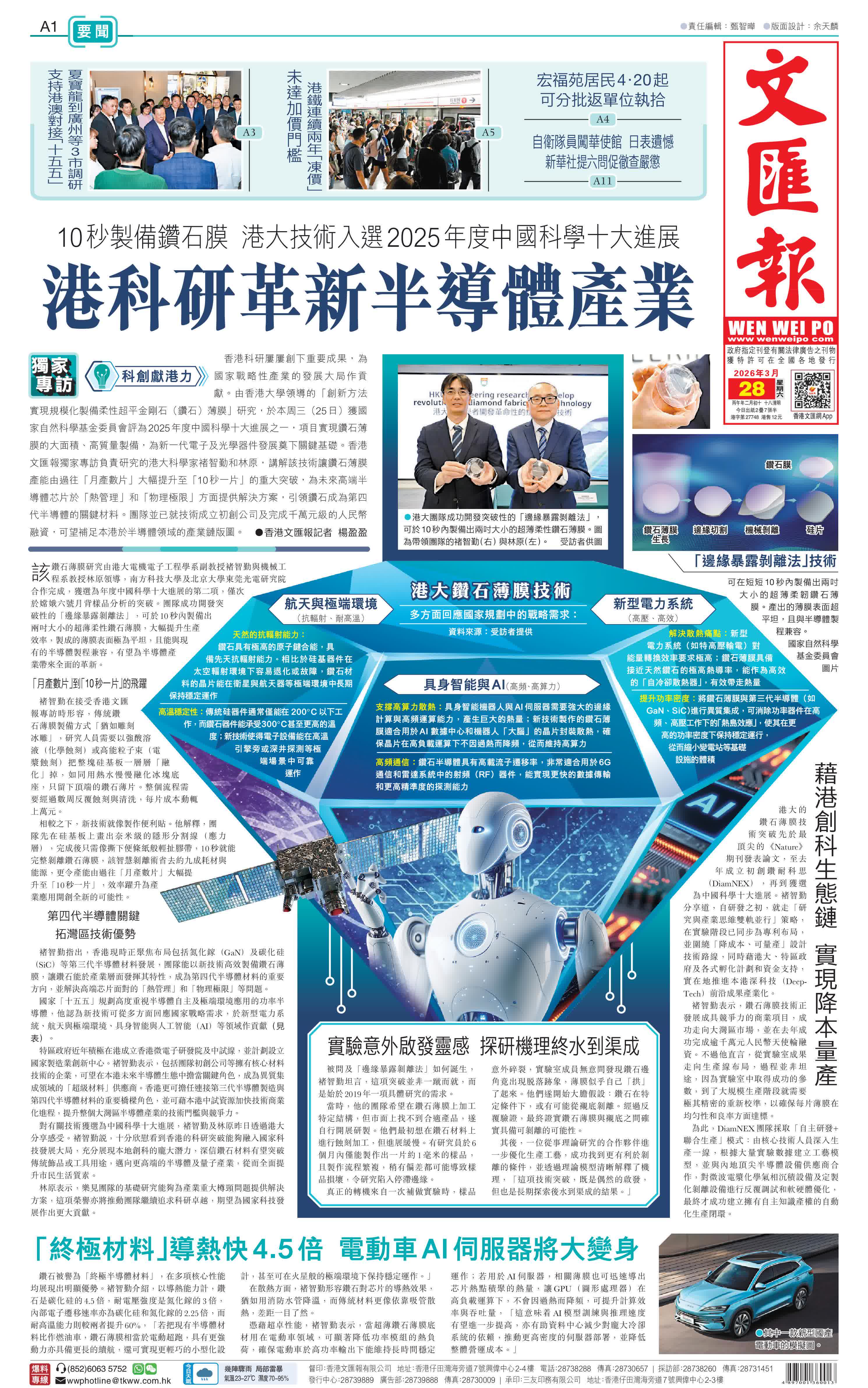 該鑽石薄膜研究由港大電機電子工程學系副教授褚智勤與機械工程系教授林原領導,南方科技大學及北京大學東莞光電研究院合作完成,獲選為年度中國科學十大進展的第二項,僅次於嫦娥六號月背樣品分析的突破。團隊成功開發突破性的「邊緣暴露剝離法」,可於10秒內製備出兩吋大小的超薄柔性鑽石薄膜,大幅提升生產效率,製成的薄膜表面極為平坦,且能與現有的半導體製程兼容,有望為半導體產業帶來全面的革新。