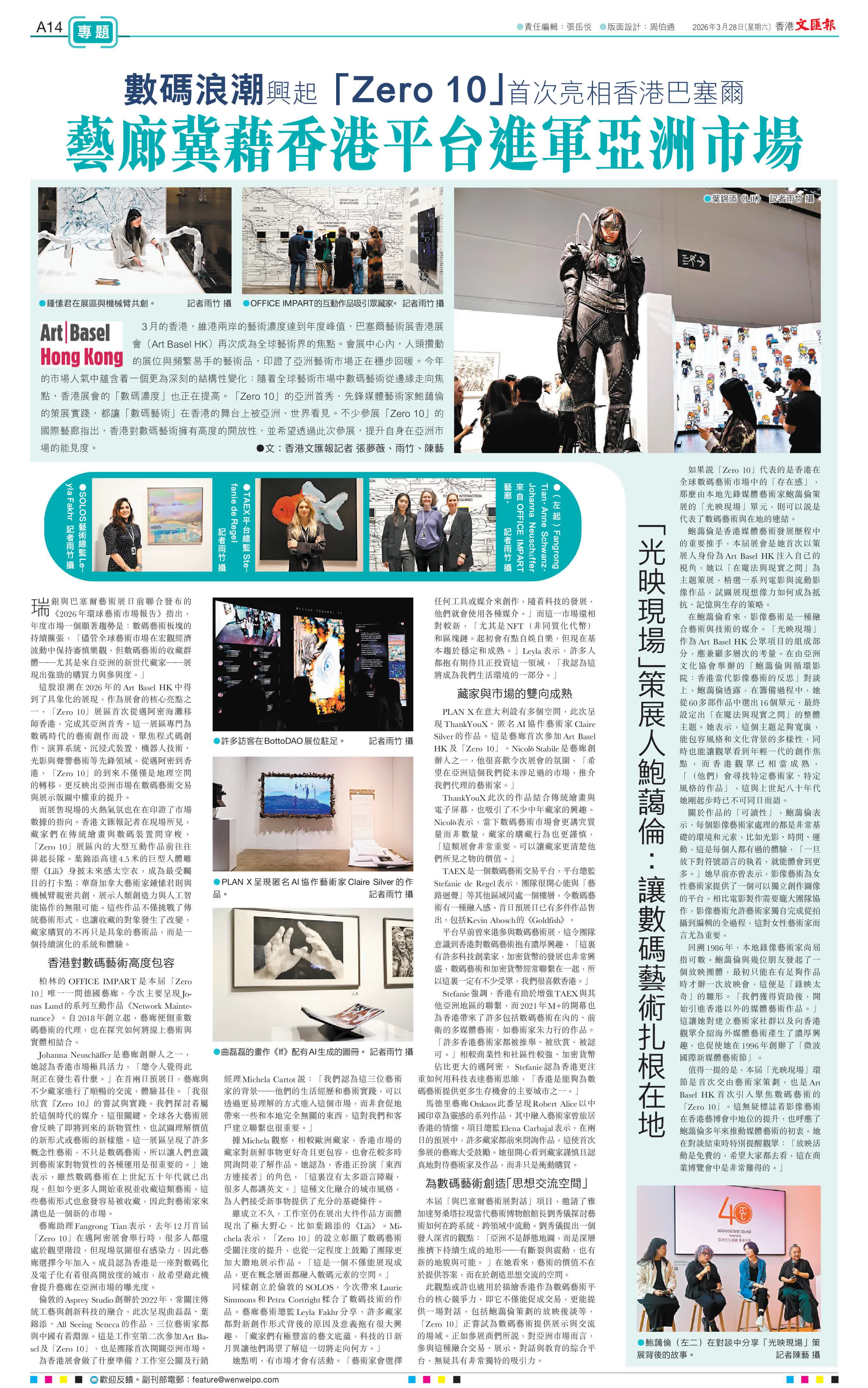 香港文匯報訊(記者 張夢薇、雨竹、陳藝)3月的香港,維港兩岸的藝術濃度達到年度峰值,巴塞爾藝術展香港展會(Art Basel HK)再次成為全球藝術界的焦點。會展中心內,人頭攢動的展位與頻繁易手的藝術品,印證了亞洲藝術市場正在穩步回暖。今年的市場人氣中蘊含着一個更為深刻的結構性變化:隨着全球藝術市場中數碼藝術從邊緣走向焦點,香港展會的「數碼濃度」也正在提高。「Zero 10」的亞洲首秀、先鋒媒體藝術家鮑藹倫的策展實踐,都讓「數碼藝術」在香港的舞台上被亞洲、世界看見。不少參展「Zero 10」的國際藝廊指出,香港對數碼藝術擁有高度的開放性,並希望透過此次參展,提升自身在亞洲市場的能見度。