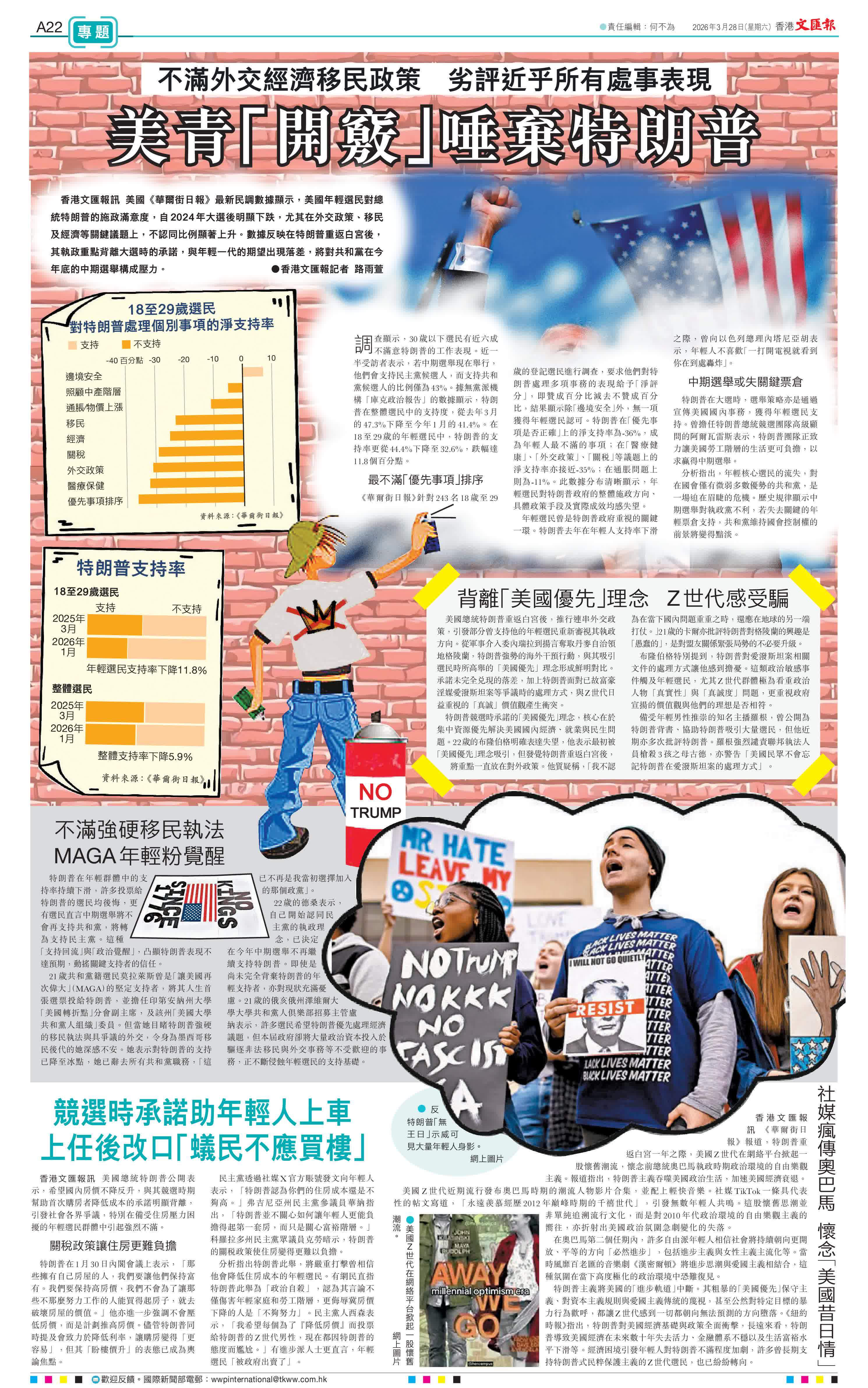 香港文匯報訊(記者 路雨萱)美國《華爾街日報》最新民調數據顯示,美國年輕選民對總統特朗普的施政滿意度,自2024年大選後明顯下跌,尤其在外交政策、移民及經濟等關鍵議題上,不認同比例顯著上升。數據反映在特朗普重返白宮後,其執政重點背離大選時的承諾,與年輕一代的期望出現落差,將對共和黨在今年底的中期選舉構成壓力。